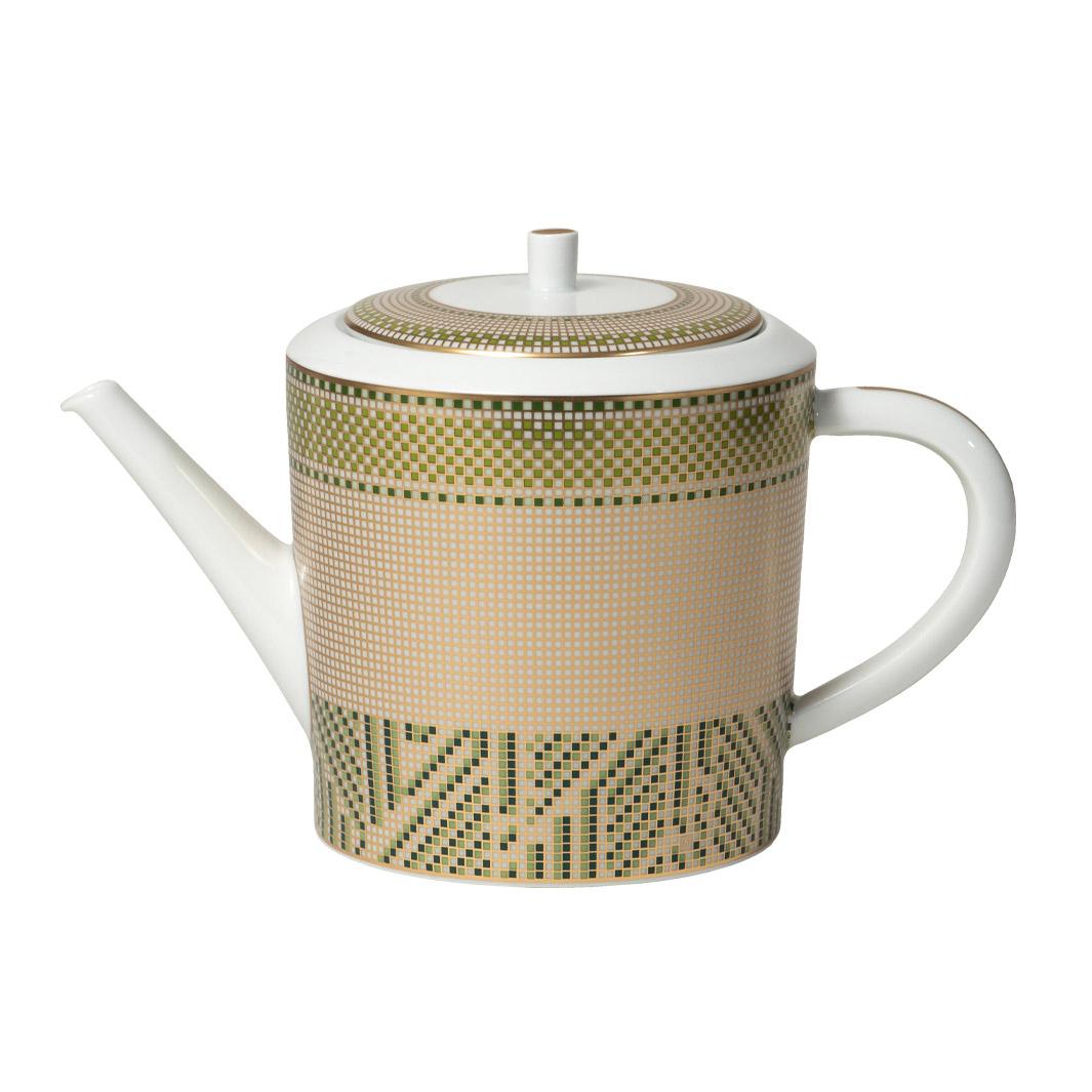 Like an antique mosaic, the decor of the collection is made up of small tiles that follow a golden grid. Cleverly placed surfaces in light green, emerald green and black form geometric patterns that could just as easily originate from a Roman villa as from a New York skyscraper of the early 20th century. Classicism meets cubism – an original mix of styles that knows how to impress with its precise execution.