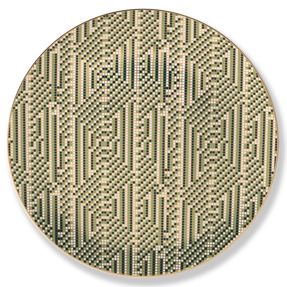 Like an antique mosaic, the decor of the collection is made up of small tiles that follow a golden grid. Cleverly placed surfaces in light green, emerald green and black form geometric patterns that could just as easily originate from a Roman villa as from a New York skyscraper of the early 20th century. Classicism meets cubism – an original mix of styles that knows how to impress with its precise execution.