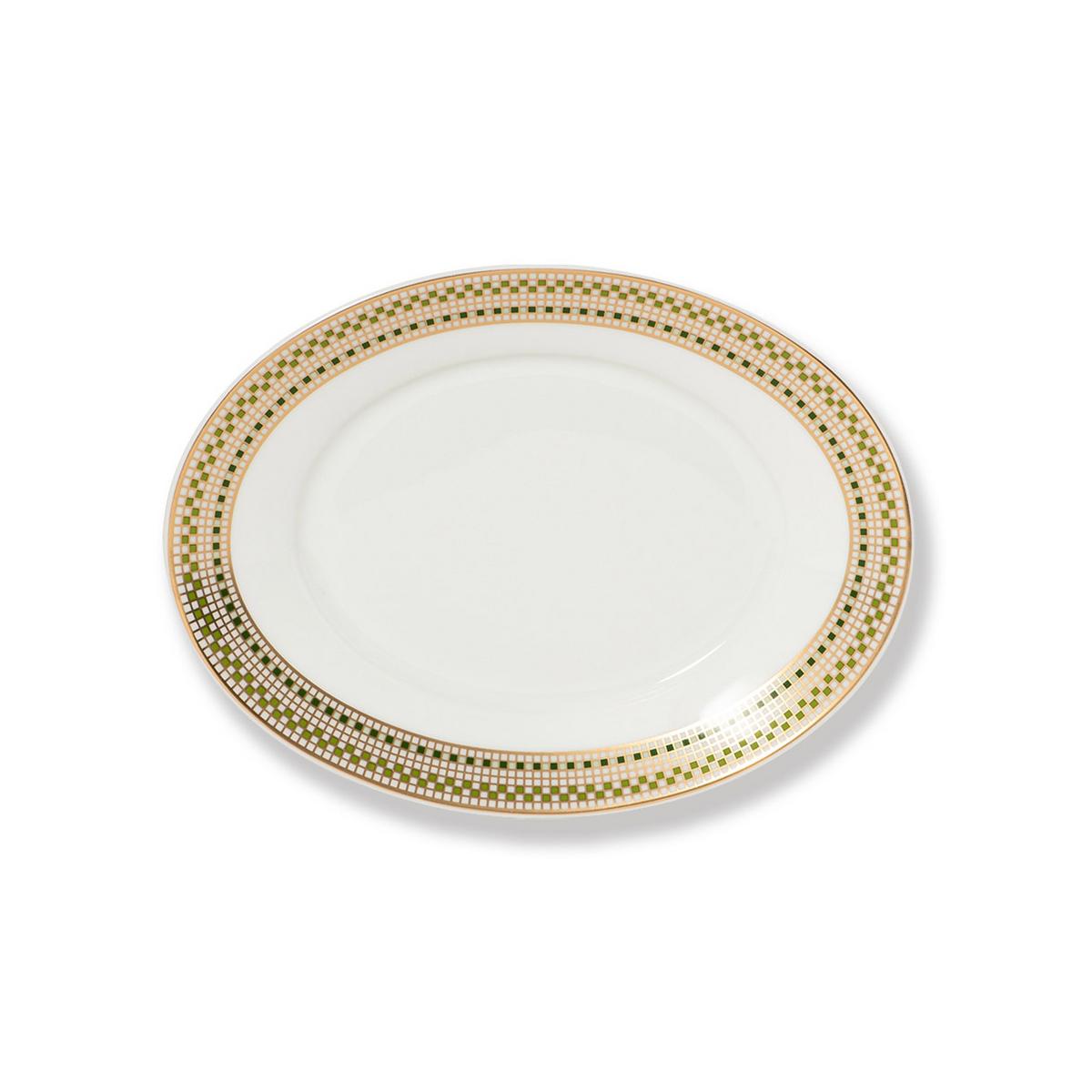 Like an antique mosaic, the decor of the collection is made up of small tiles that follow a golden grid. Cleverly placed surfaces in light green, emerald green and black form geometric patterns that could just as easily originate from a Roman villa as from a New York skyscraper of the early 20th century. Classicism meets cubism – an original mix of styles that knows how to impress with its precise execution.