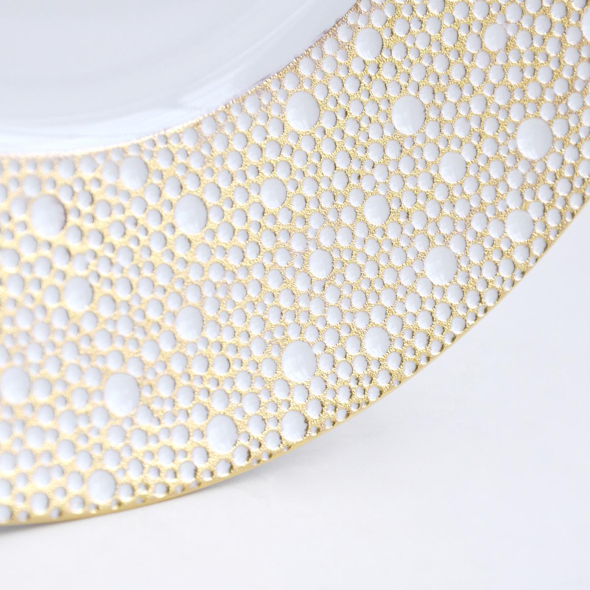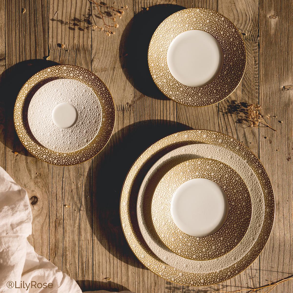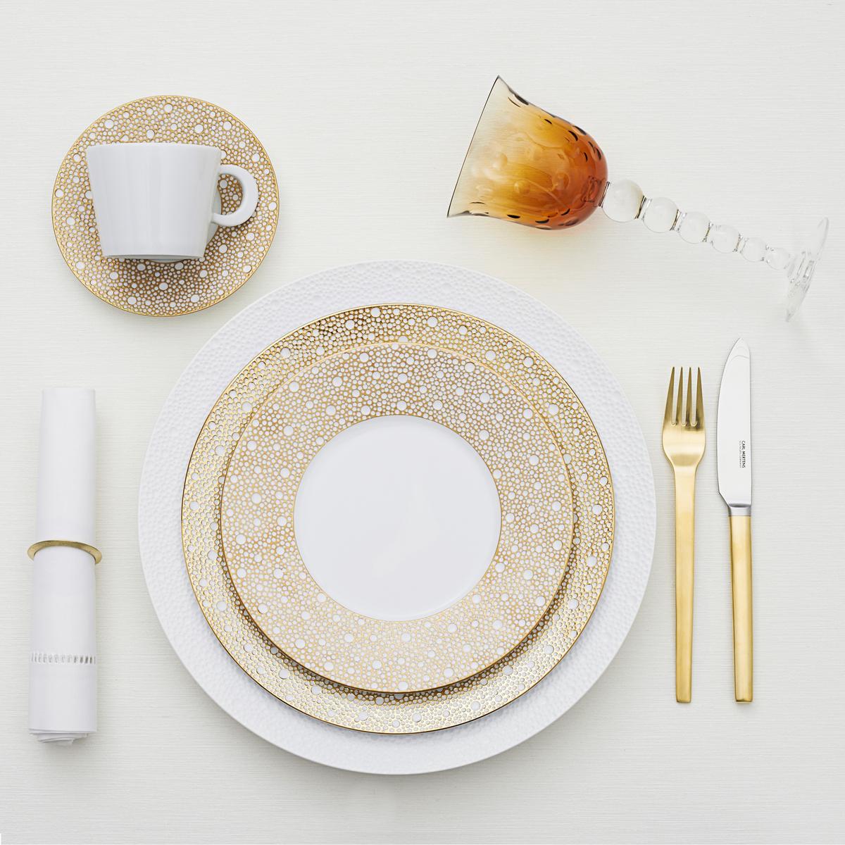 The French porcelain manufacturer Bernardaud has refined the "Ecume White" dinner service with gold to produce this elegant "Ecume Mordoré" line. "Ecume Mordoré" can be combined beautifully with "Ecume White". The new “Ecume Mordoré” line displays the same exciting structures on the rims of the plates. The sea provided the inspiration for this fine Limoges porcelain. Or more precisely the trails that its waves leave on the fine sand.