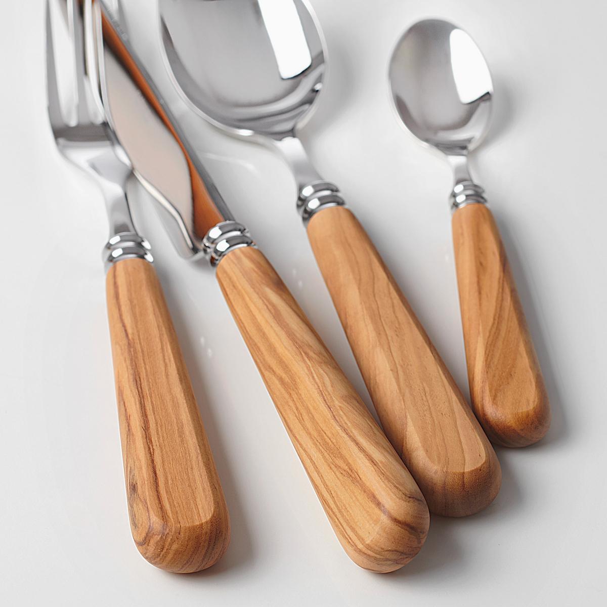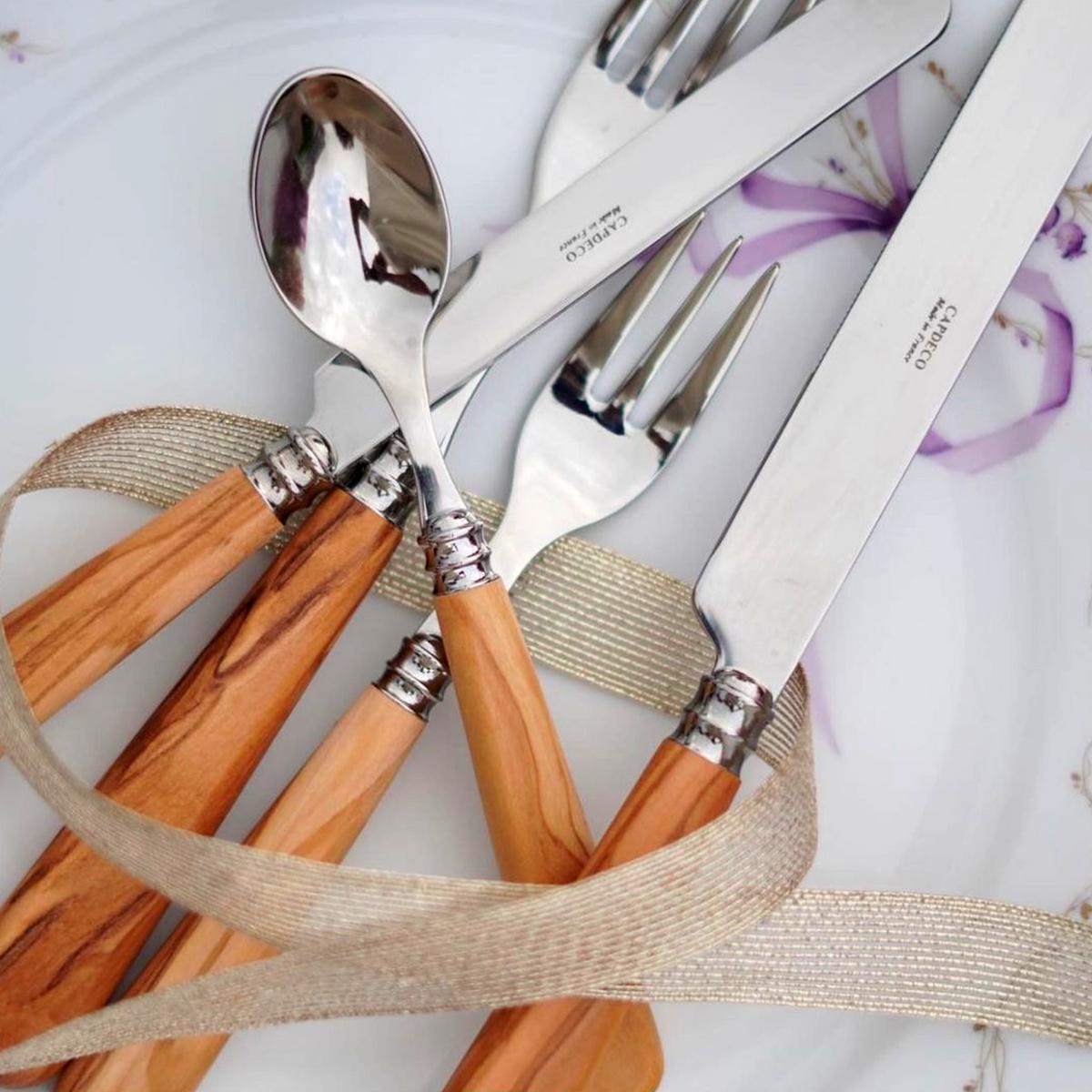 Simple and clean in shape, the "Cambridge" cutlery by Capdeco impresses with its fine craftsmanship. The handles are crafted from solid olive wood – a particularly hard and durable material valued for its striking grain and pleasant feel. Each piece is one of a kind. The stainless-steel components are perfectly balanced and comfortable to hold, making this cutlery ideal for everyday dining as well as special occasions.