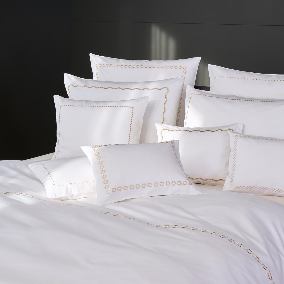 The "Cadena" bed linen by Christian Fischbacher combines the finest cotton sateen with a striking decorative embroidery. Like a delicate chain, the pattern runs across the duvet and frames the pillow like a piece of jewelry. The intricate embroidery creates a subtle three-dimensional effect and a soft shimmer that changes with the light.
