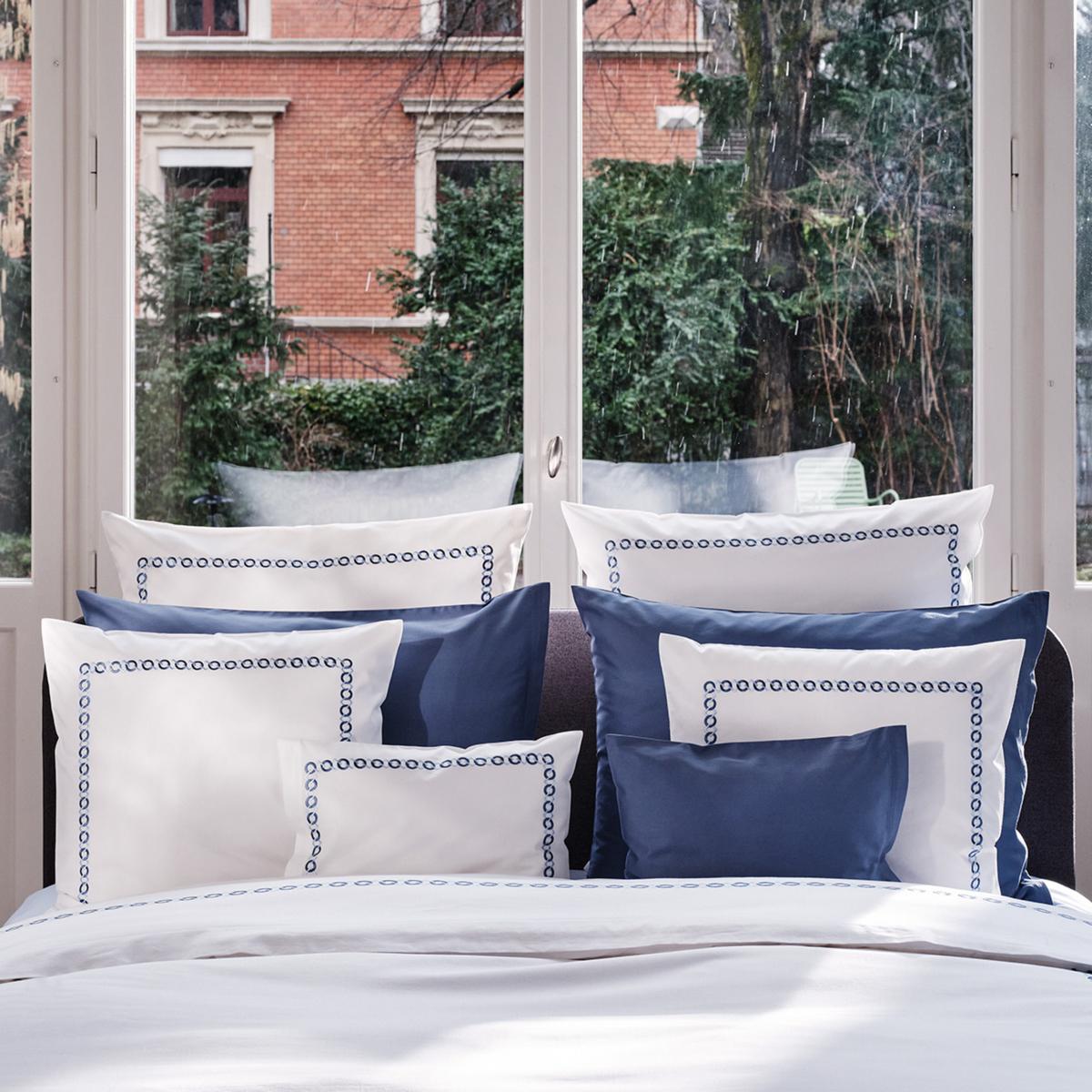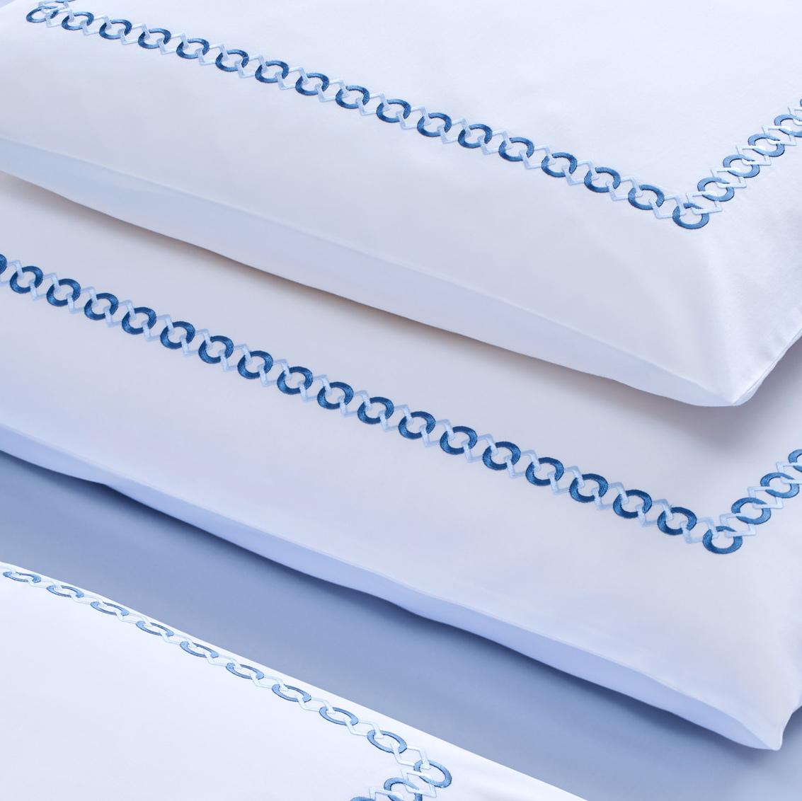 The "Cadena" bed linen by Christian Fischbacher combines the finest cotton sateen with a striking decorative embroidery. Like a delicate chain, the pattern runs across the duvet and frames the pillow like a piece of jewelry. The intricate embroidery creates a subtle three-dimensional effect and a soft shimmer that changes with the light.