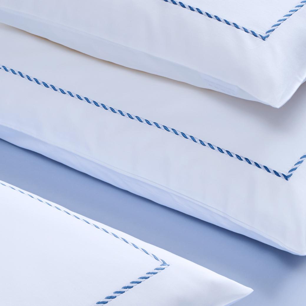 The "Corda" bed linen by Christian Fischbacher combines the finest cotton sateen with a subtle decorative touch. A delicately embroidered blue-and-white cord frames the pillows and duvet covers, adding an accent that is both elegant and playful. Flowing like a ribbon, the embroidery lies gracefully on the smooth, gently shimmering fabric, lending classic white bed linen a distinctive refinement.