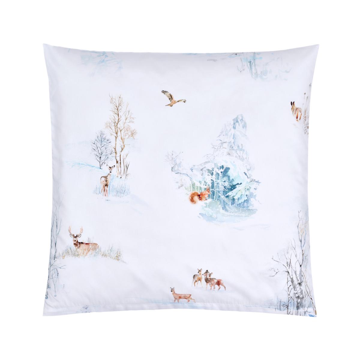 The "Finja" bed linen by Christian Fischbacher is a captivating design that continues the beloved tradition of the Christian Fischbacher signature style. Delicate brushstrokes bring to life squirrels, snow-covered dwarf birches, and the tracks of wild geese in the snow. A majestic red kite circles above the wintry landscape. Rendered in gentle shades of beige, brown, and blue, these artistic winter motifs invite you to dream.