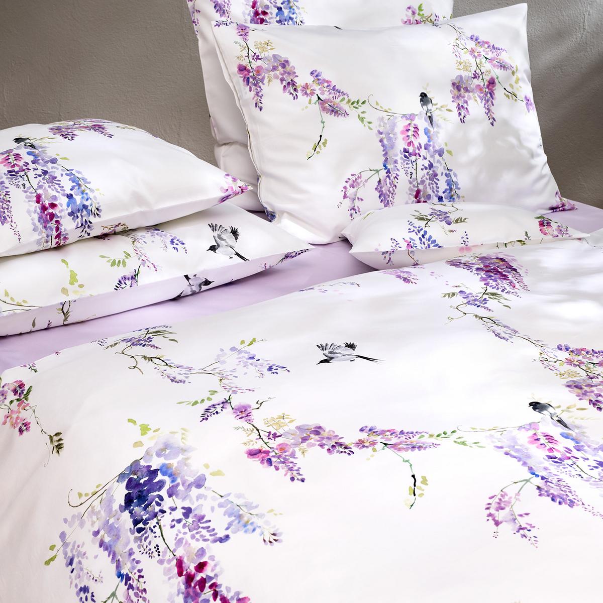 From rose to pink, purple and blue, the blossoms of the Japanese blue rain cover the duvet covers and cushions of the "Purple Rain" bed linen by Christian Fischbacher like a fine mist. In between, the chirping of young swallows can be heard, perched on fine branches or soaring high in the air. The motifs were skilfully watercoloured in the Christian Fischbacher studio and printed on the fabric in their print shop in Italy with great attention to detail.