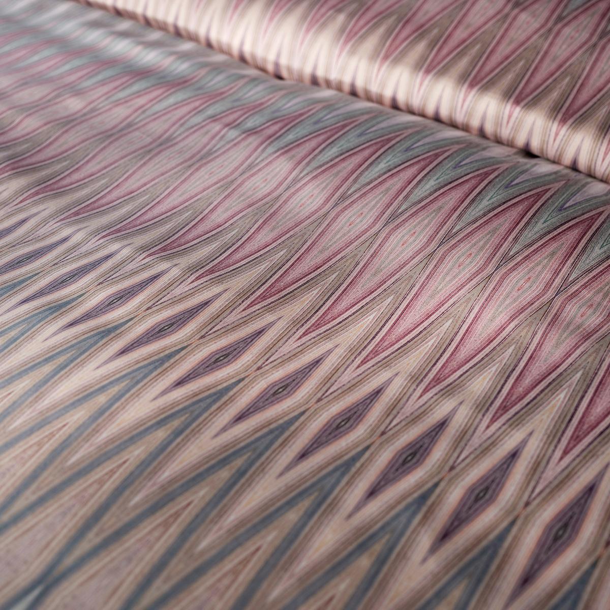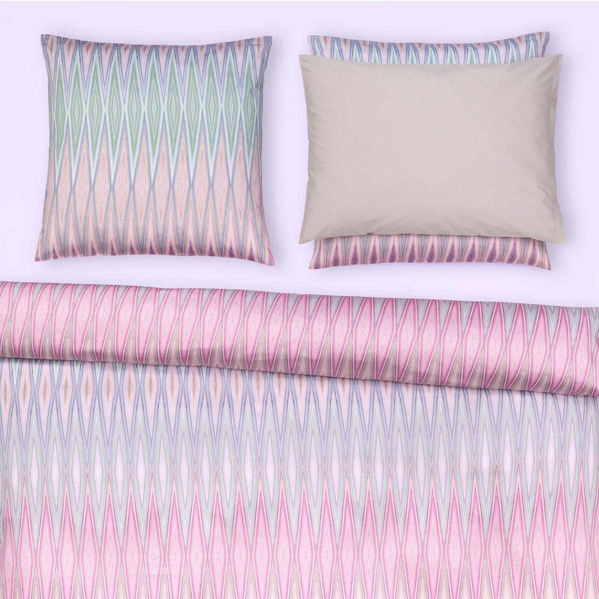 Generous rhombuses on the "Rhythm" bed linen by Christian Fischbacher imitate the elaborate art of ikat weaving. A technique that creates a typical, slightly blurred look in the motifs thanks to the partial colouring of the yarn. In a modern interpretation, "Rhythm" surprises with fine lines that reveal a variety of colours on closer inspection.