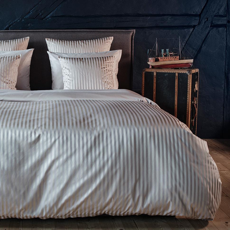 A perfect harmony of ease and comfort. The "Seta Cotone" bed linen in the colourway bronze-gold by Christian Fischbacher is made from an innovative blend of 60% silk and 40% cotton. The high silk content gives the fabric a delicate texture that glides gently over skin and hair. Shimmering softly in a delicate silk lustre, the timelessly elegant striped design in bronze and gold makes going to bed every day even more irresistible.