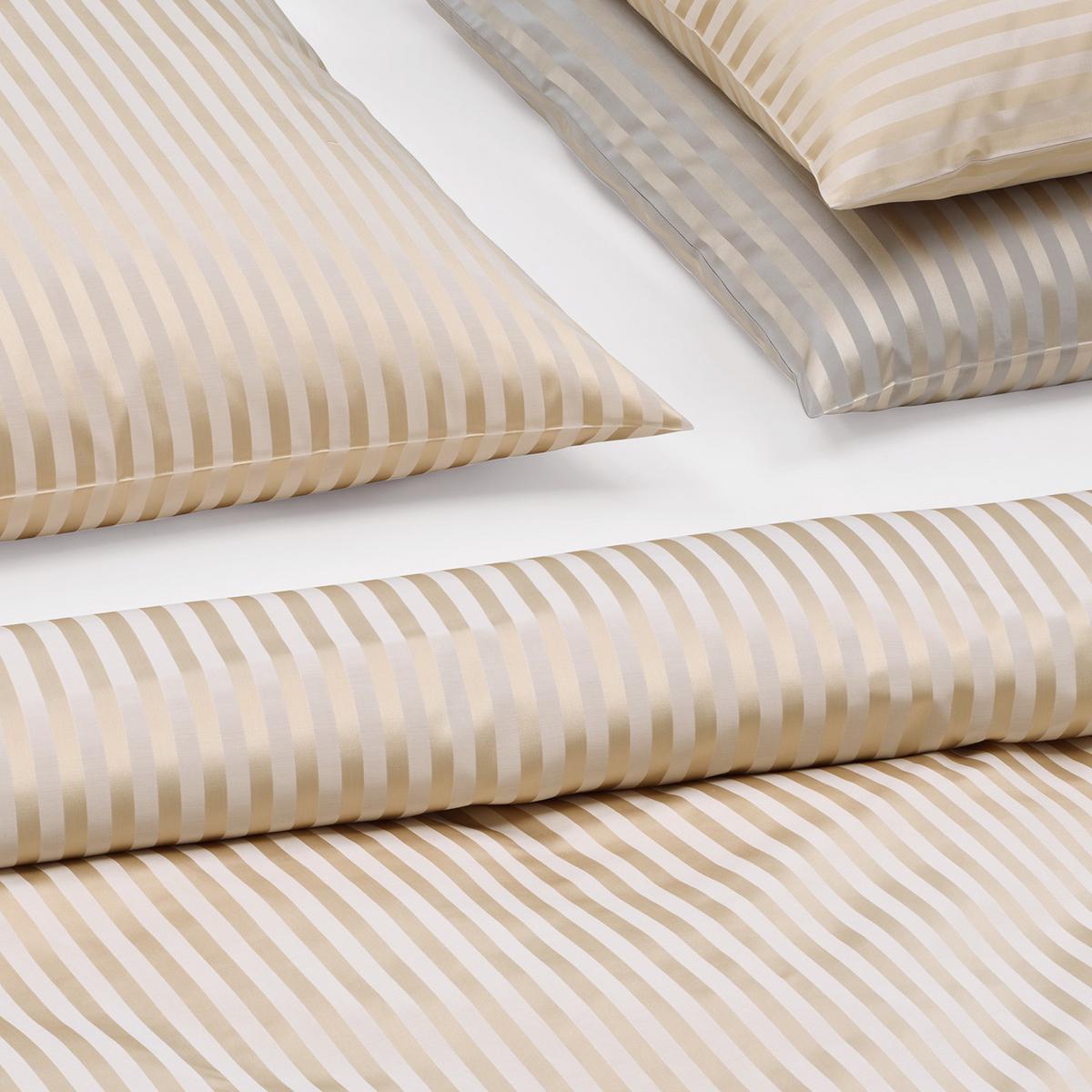 A perfect harmony of ease and comfort. The "Seta Cotone" bed linen in the colourway ivory by Christian Fischbacher is made from an innovative blend of 60% silk and 40% cotton. The high silk content gives the fabric a delicate texture that glides gently over skin and hair. Shimmering softly in a delicate silk lustre, the timelessly elegant striped design in gold and ivory makes going to bed every day even more irresistible.