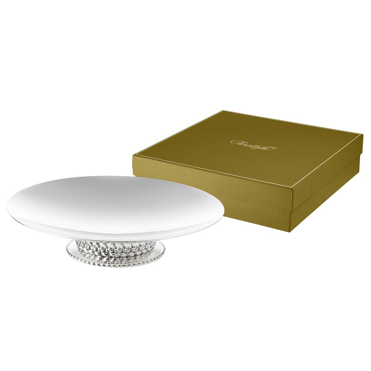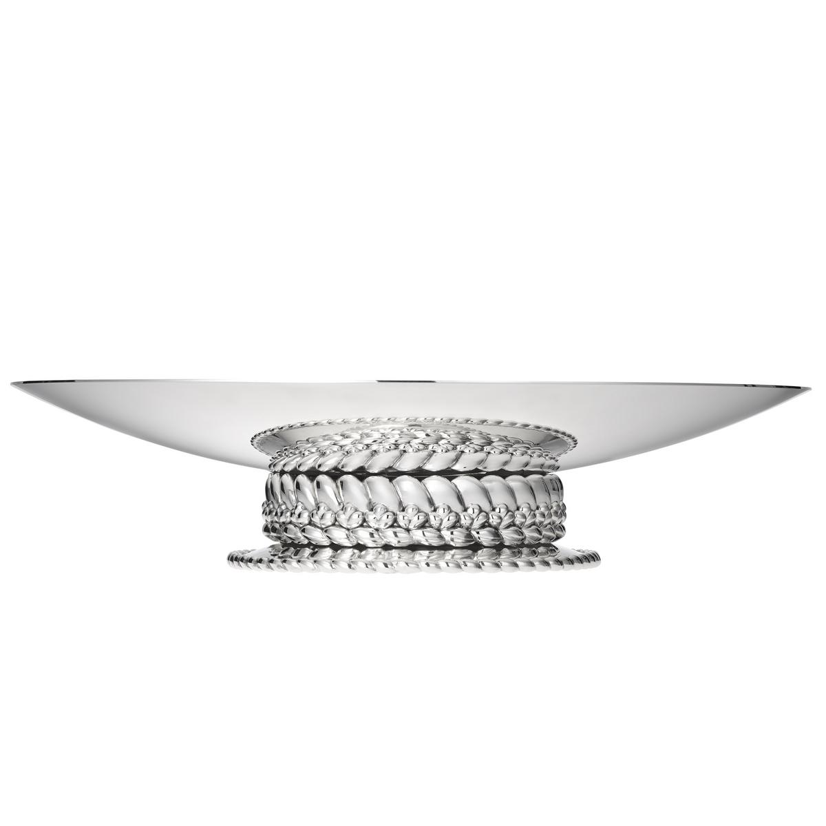 Receive and entertain your guests in the generous lifestyle of the best addresses in Paris with the silverplated "Babylone" centrepiece by Christofle. As the masterpiece of the "Babylone" collection, the centrepiece consists of an expansive bowl enthroned on a sensational base. Made in the elaborate lost-wax process, its sensual décor amazes with deep reliefs and the organic curves of a freshly baked brioche braid. A hand-applied patina accentuates the details of the décor and contrasts with the minimalist style of the bowl. Present and serve snacks, fruit and pastries on the centrepiece or employ it as a majestic decorative object.