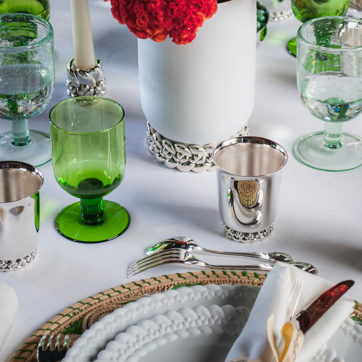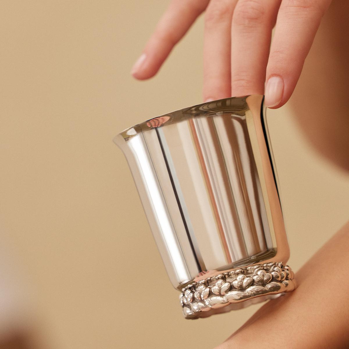 Generous, sensual, organic. The silverplated "Babylone" cup by Christofle brings the glamour and lifestyle of the best addresses in Paris into your interiors. The minimalist cup is enthroned on a sensational base. Made in the elaborate lost-wax process, its sensual décor amazes with deep reliefs and the organic curves of a freshly baked brioche braid. A hand-applied patina accentuates the details of the décor and contrasts with the clear lines of the cup. Give the cup as a christening cup or use it as a versatile water cup, pen holder, bathroom accessory, and fascinating decorative object.