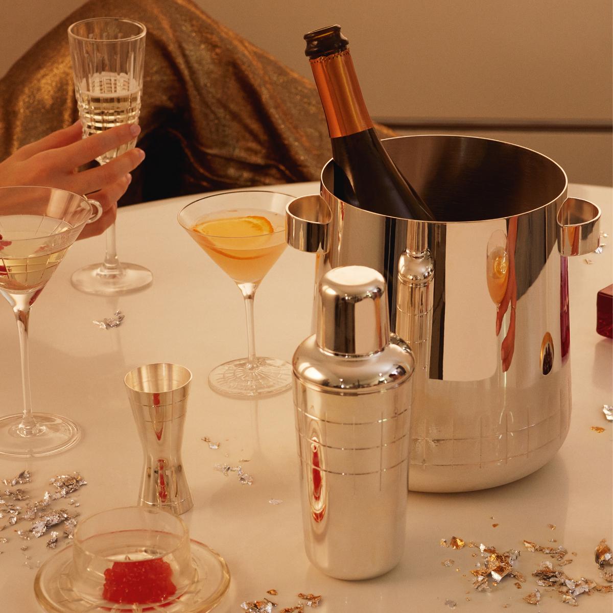 From preparing your cocktails to presenting your finest bottles, the "Graphik" collection - silverplated in the Christofle workshops in Normandy - will accompany you throughout your evening parties, to celebrate an event, share and enjoy a magical moment. Like all bar accessories from the Christofle "Graphik" collection, the elegant "Graphik" Champagne cooler & ice bucket are adorned with a striking lattice pattern of horizontal and vertical lines. Each piece is highlighted by a mirror finish, a signature of Christofle’s know-how.