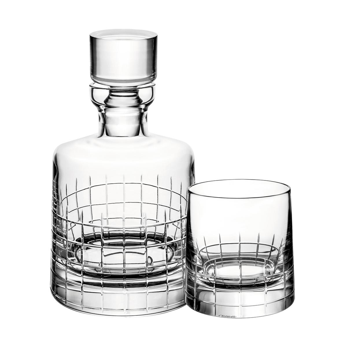 Vertical and horizontal cuts produce a striking grid pattern on the "Graphik" glasses from Christofle. The clear geometric design is timeless. The bottom of the "Graphik" bar glasses are of a solid quality, made of flawless crystal glass.