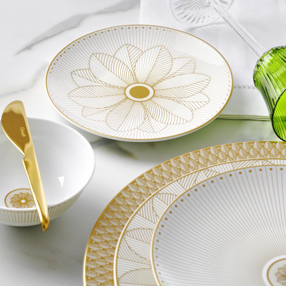 Majestic splendour for the modern table. With the "Malmaison Impériale Gold" dinner service, Christofle reinterprets the historical Empire style for the current zeitgeist. Sometimes minimal and abstract, sometimes opulent and floral, the elegant décors play with the emblematic palmette motif of the classic "Malmaison" collection. Made of pure Limoges porcelain and refined with fine gold, the dinner service is a worthy heir to the imperial original from the times of Napoleon.
