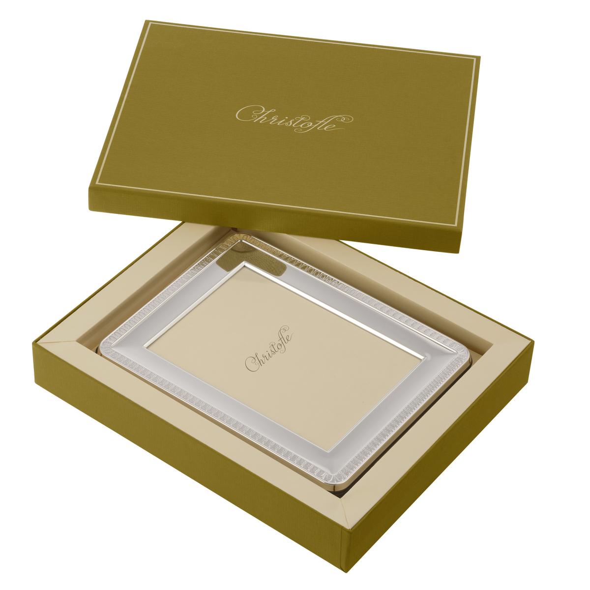 The new edition of Christofle's picture frames has a black lacquered wooden back lined with felt. The picture frames are easy to open and close thanks to a pivoting latch made of lustrous Zamak alloy and embossed with the Christofle coat of arms. Safely packaged in an antioxidant pouch and presented in an exclusive Christofle gift box, these frames make exquisite gifts for special occasions.