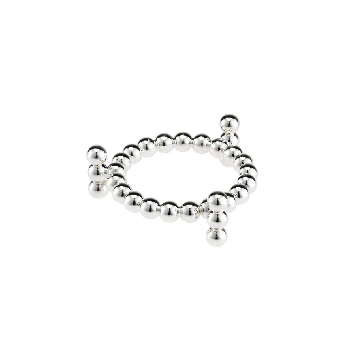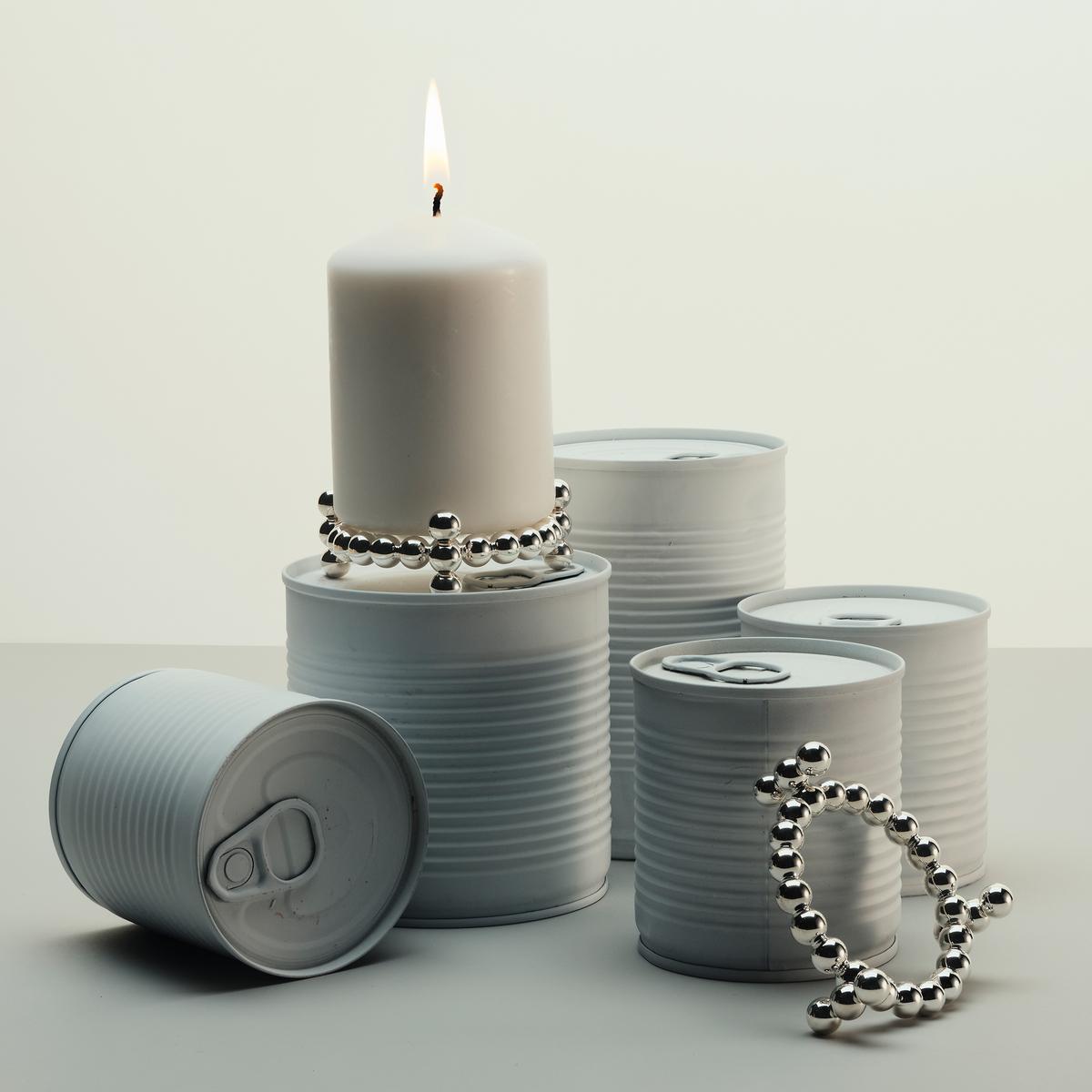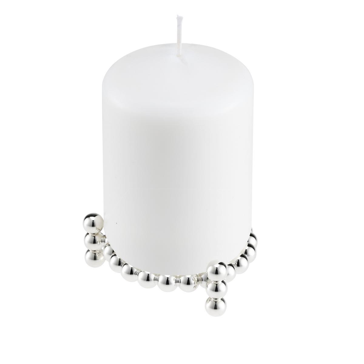 A pearl of French tableware. The "Perles" candle jewel is a timelessly elegant table decoration from the traditional silversmiths of Christofle. Silver-plated beads are strung together like pearls on a necklace to form a shimmering ring. Three small feet balance the ring and the candle placed upon it above the table with feminine grace.