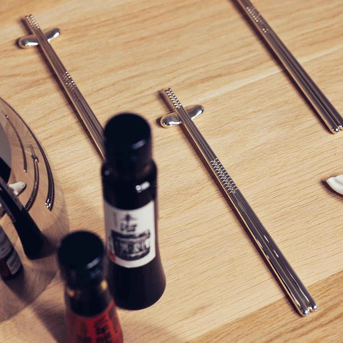 The 24-piece silverplated Asian cutlery set for 6 persons is located in an elegant walnut wood insert in the highly polished stainless steel housing. "Mood Asia" is perfect for many occasions - from an elegant Sunday evening dinner to a gourmet takeaway of Asian cuisine. To enhance the tasting experience, Christofle has developed new chopsticks and chopstick holders, all in silverplated, as well as a new soup spoon suited to Asian bowls.