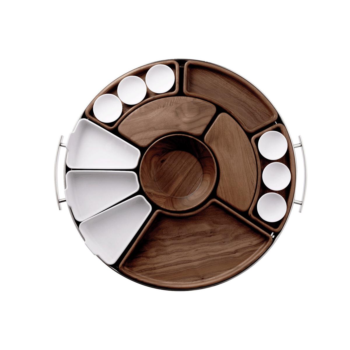 The custom-fit inserts can be freely removed and rearranged. The wooden inserts are made of walnut and treated with food-safe varnish. Use the wooden inserts as bowls or turn them around to use them as flat boards.