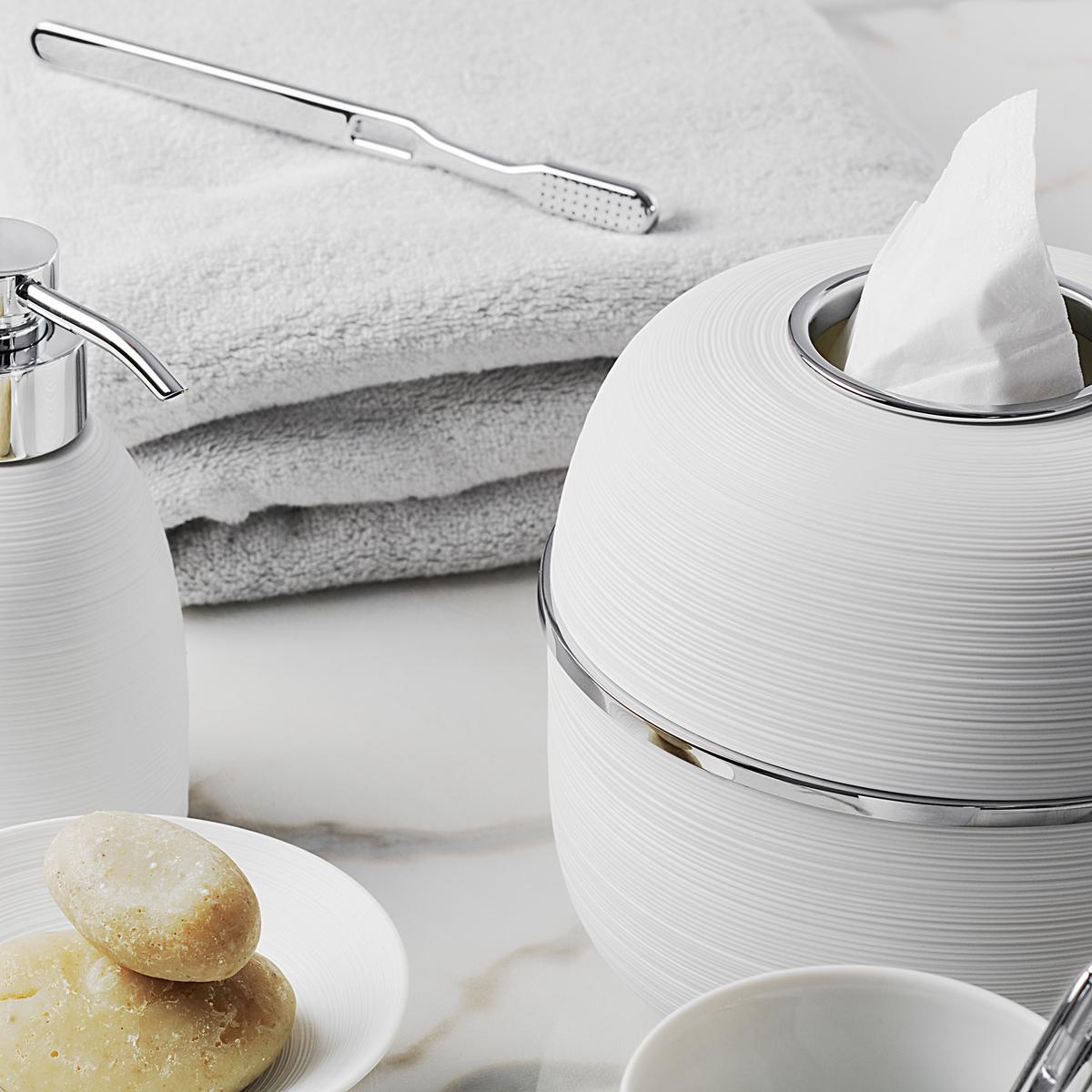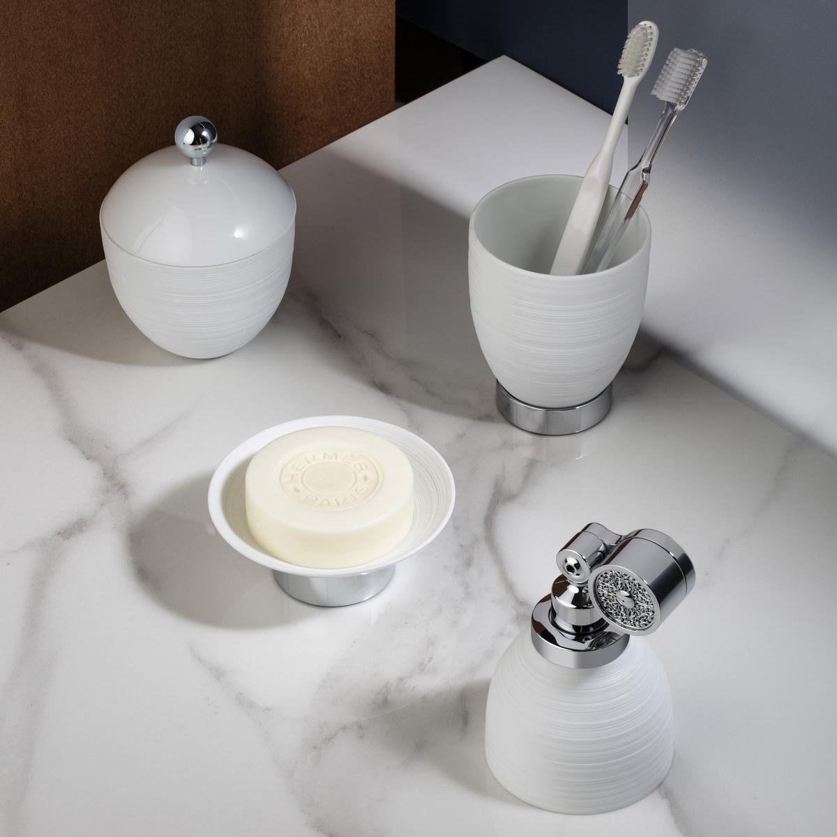 Cristal et Bronze produces the chrome-plated brass elements by hand in their manufactory south of Paris. The metal's flawless chrome finish further enhances the organic quality of the porcelain. The collection covers the full range of Cristal et Bronze bathroom accessories, from soap dispensers and soap dishes to trays to tissue boxes.
