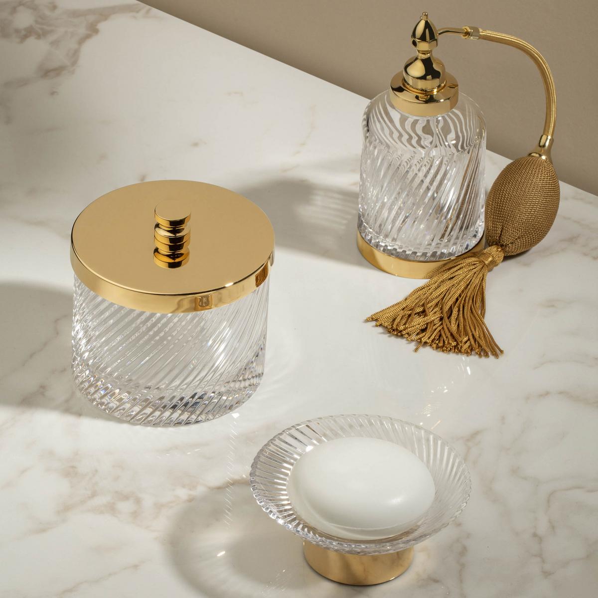 Crystal in motion. The "Infini" bathroom accessories in gold by Cristal et Bronze invigorate your bathroom countertop with an elegant dynamism. The bathroom accessories are made of hand-cut crystal glass and handmade, gilded brass elements. The minimalist spiral cut pattern transforms the simple accessories into brilliant sculptures.