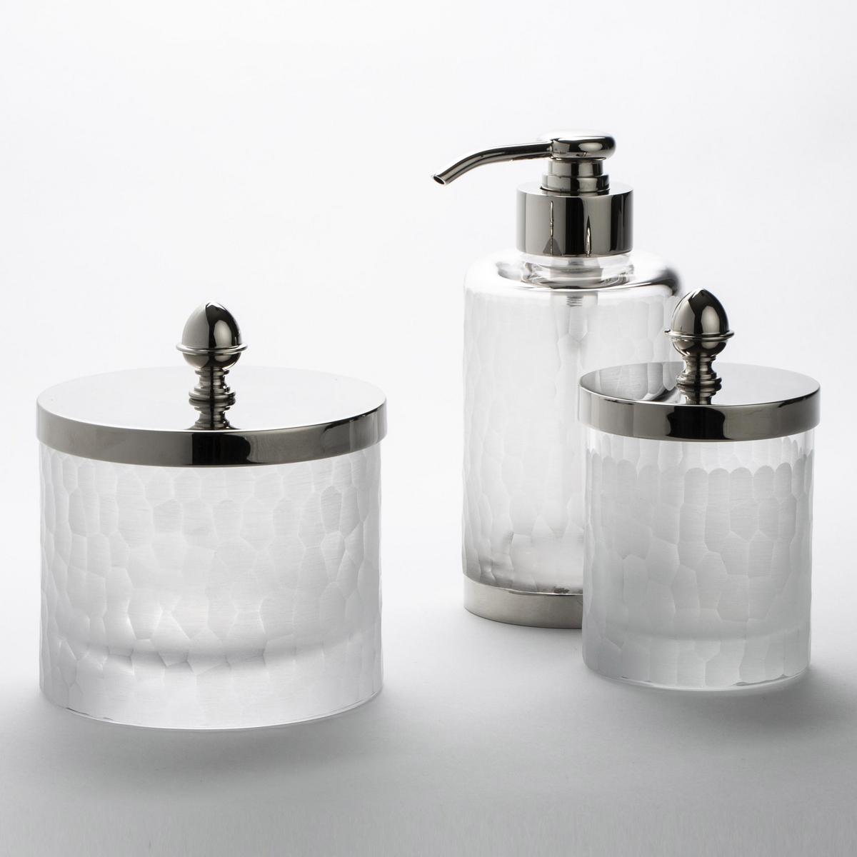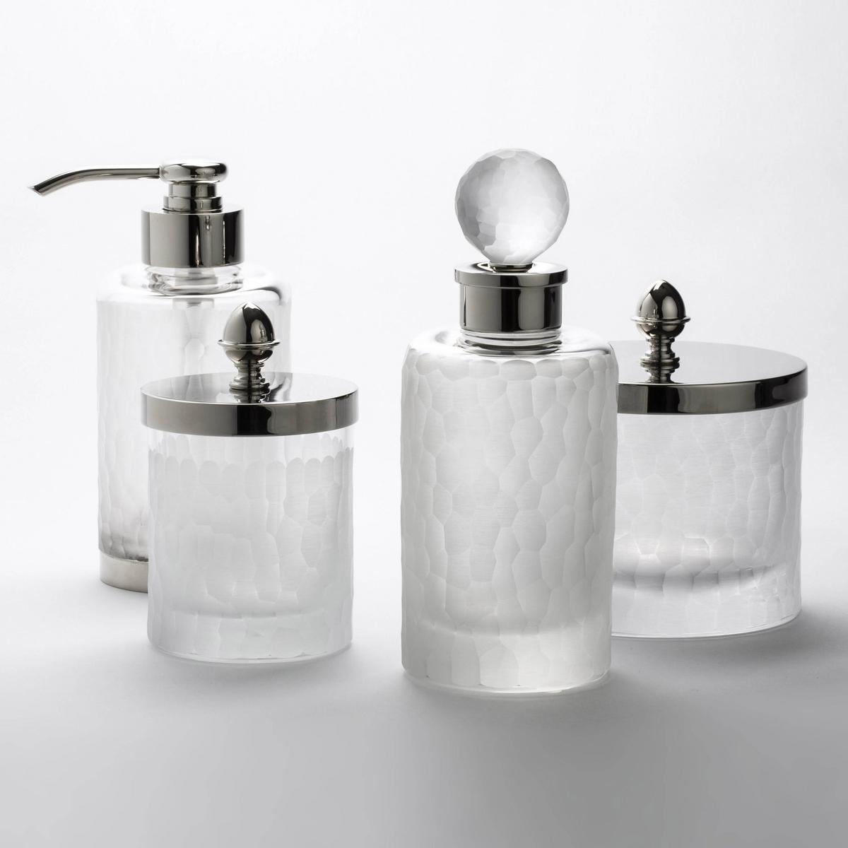 The chrome-plated brass elements are made purely by hand in the Cristal et Bronze manufactory near Paris. In the hands of traditionally trained craftsmen, glass and metal merge into one. The "Nid d'Abeilles" collection encompasses the full Cristal et Bronze product range, from soap dispensers and toothbrush tumblers to storage trays, jars, tissue boxes and a stunning wastepaper basket.