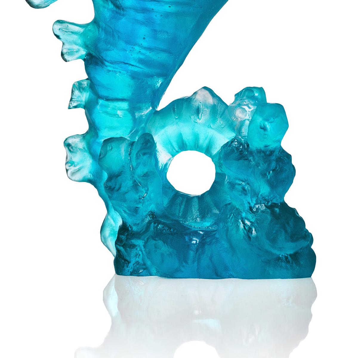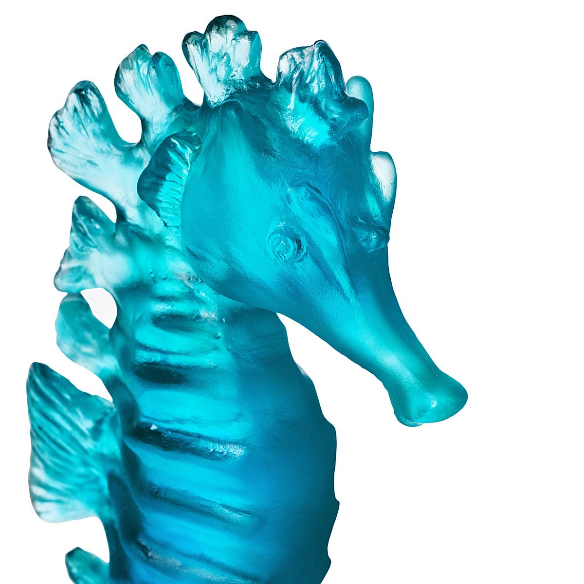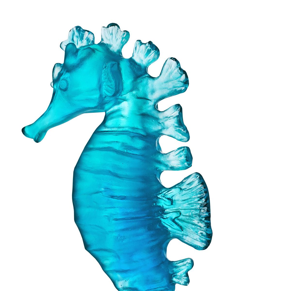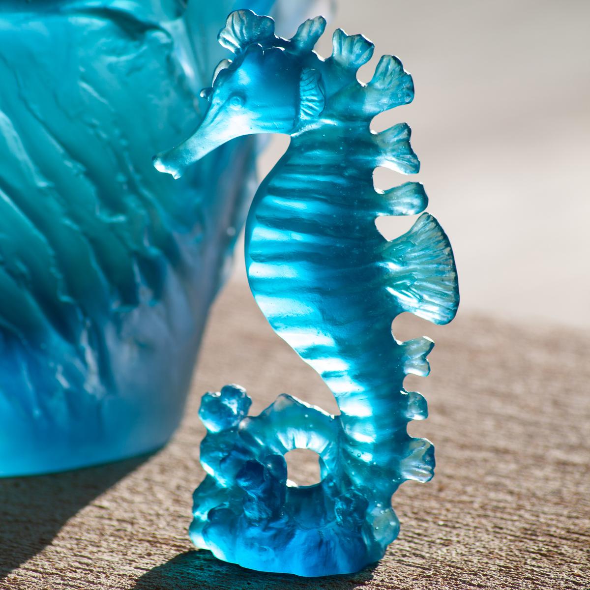 Follow the "Maya" seahorse by Daum into the crystal-clear waters of the Caribbean. The small sculpture is created from pure Pâte de Cristal using the elaborate lost wax process. Tiny details bring the naturalistically depicted seahorse to life. A subtle colour gradient from navy blue to turquoise gives the sculpture the appearance of being made of crystallised seawater. The sculpture is an exceptional maritime gift idea for lovers of the sea.