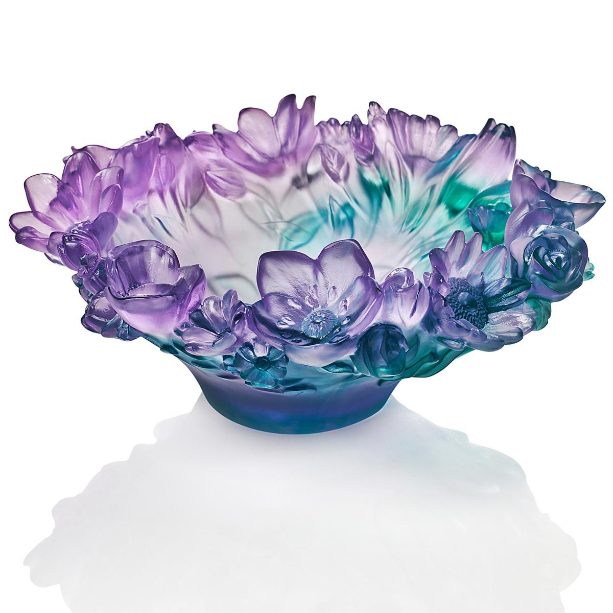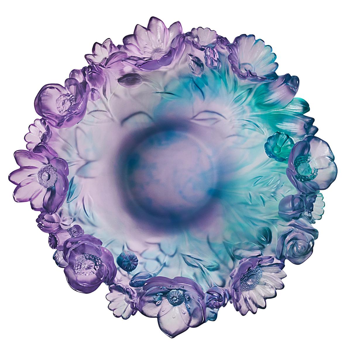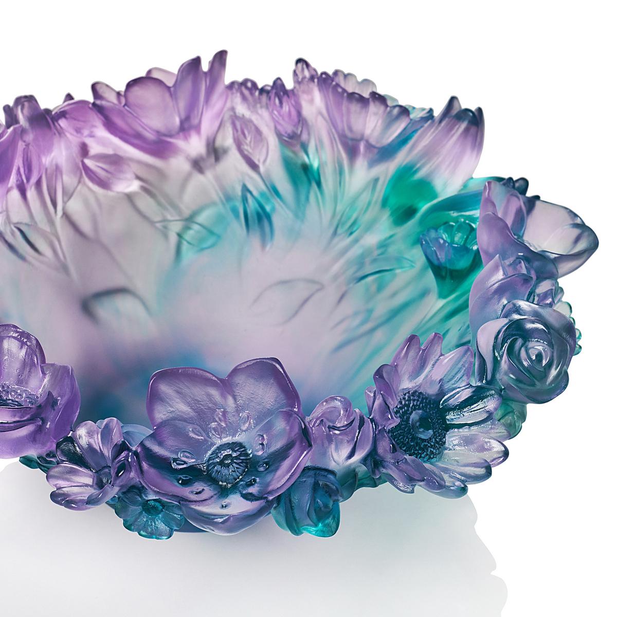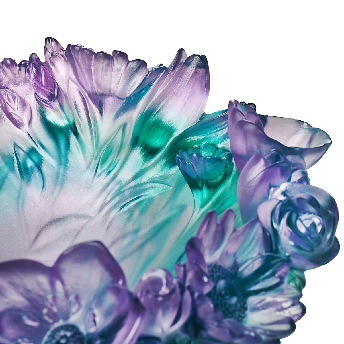 The "Sweet Garden" bowl by Daum celebrates the beauty of the wild and garden flowers we encounter beyond the beaten path. The sculptural bowl consists of a rich bouquet of delicate blossoms and leaves that unfold vividly towards the sky. A soft gradient of colour from deep blue-green to graceful shades of purple gives the bowl a delicate, elegant, and aquatic character that will soothe and refresh you.