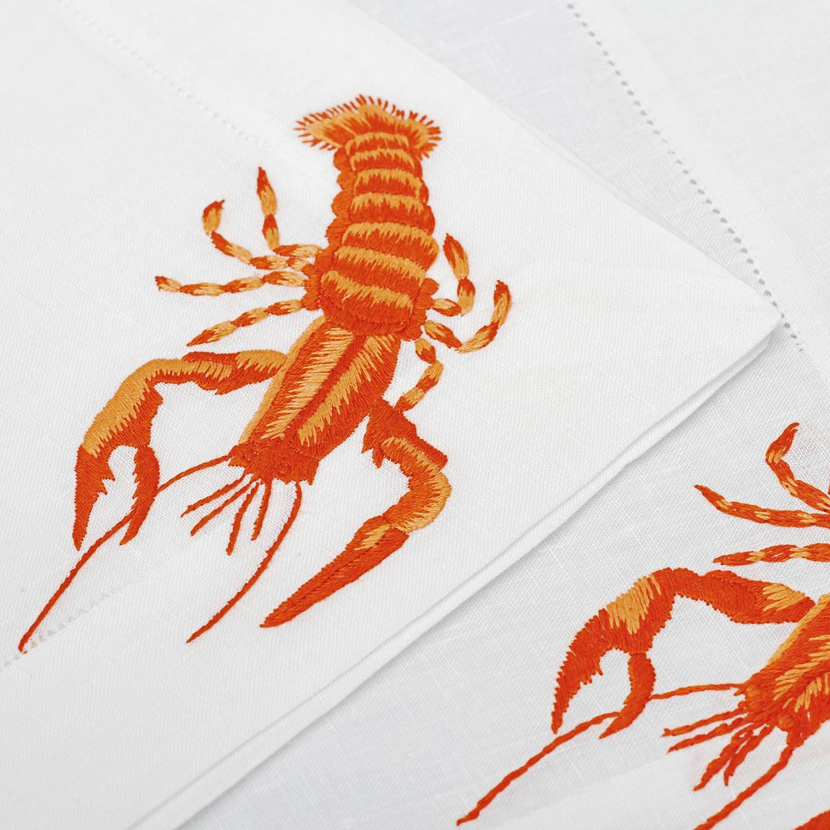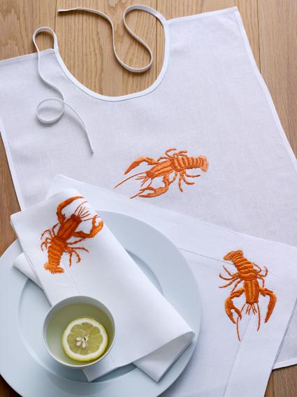 Quality food on quality fabric: pure linen, hand embroidered with crayfish. The special bibs for lobster dinner parties are particularly appealing. Also available as a napkin and place mat. Table cloths can be ordered in special sizes, if required (delivery time: two to three months).