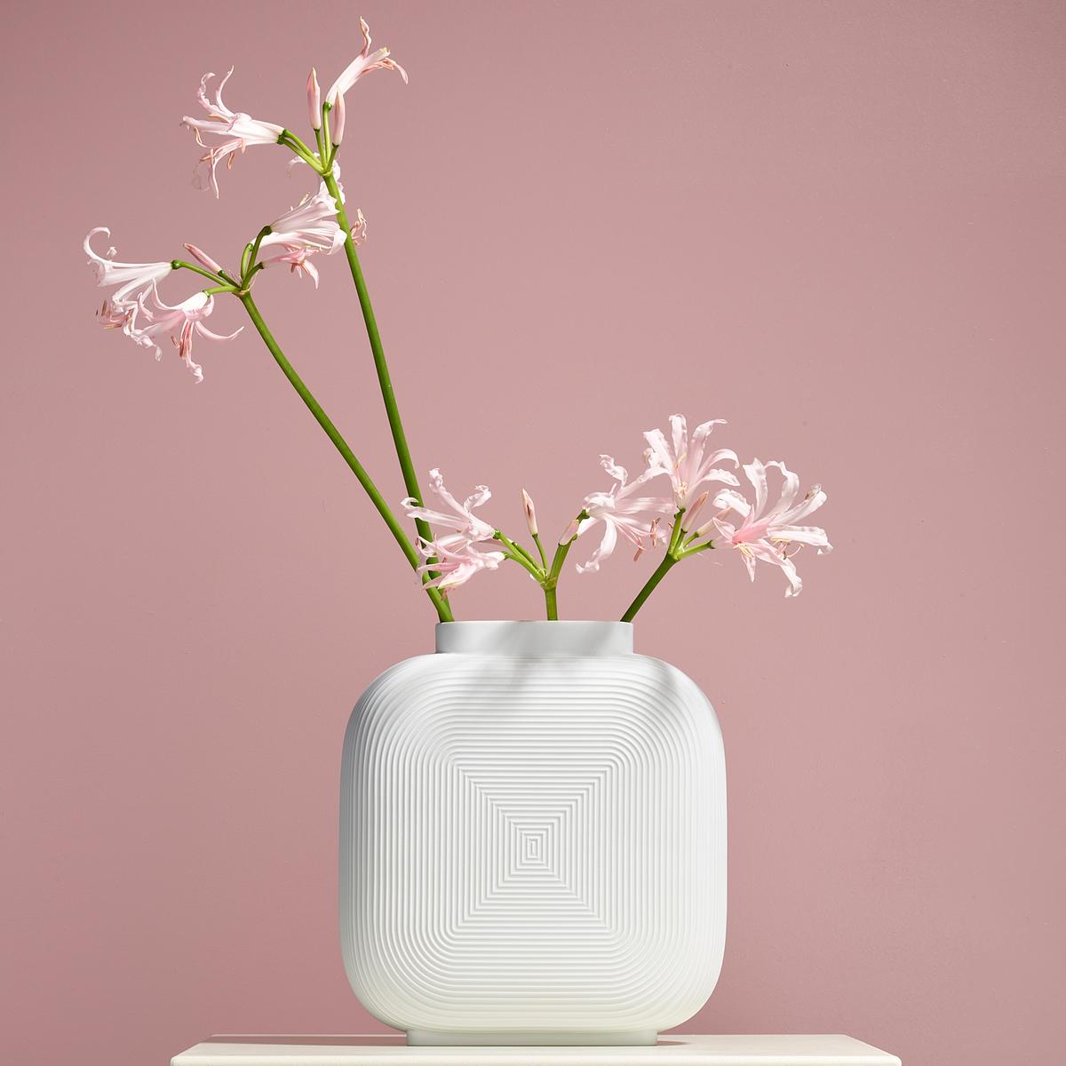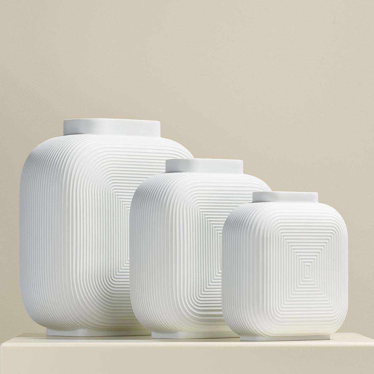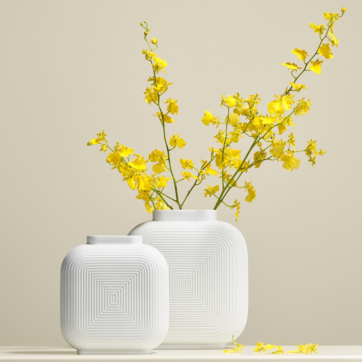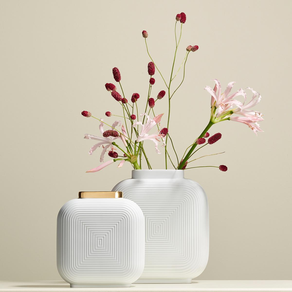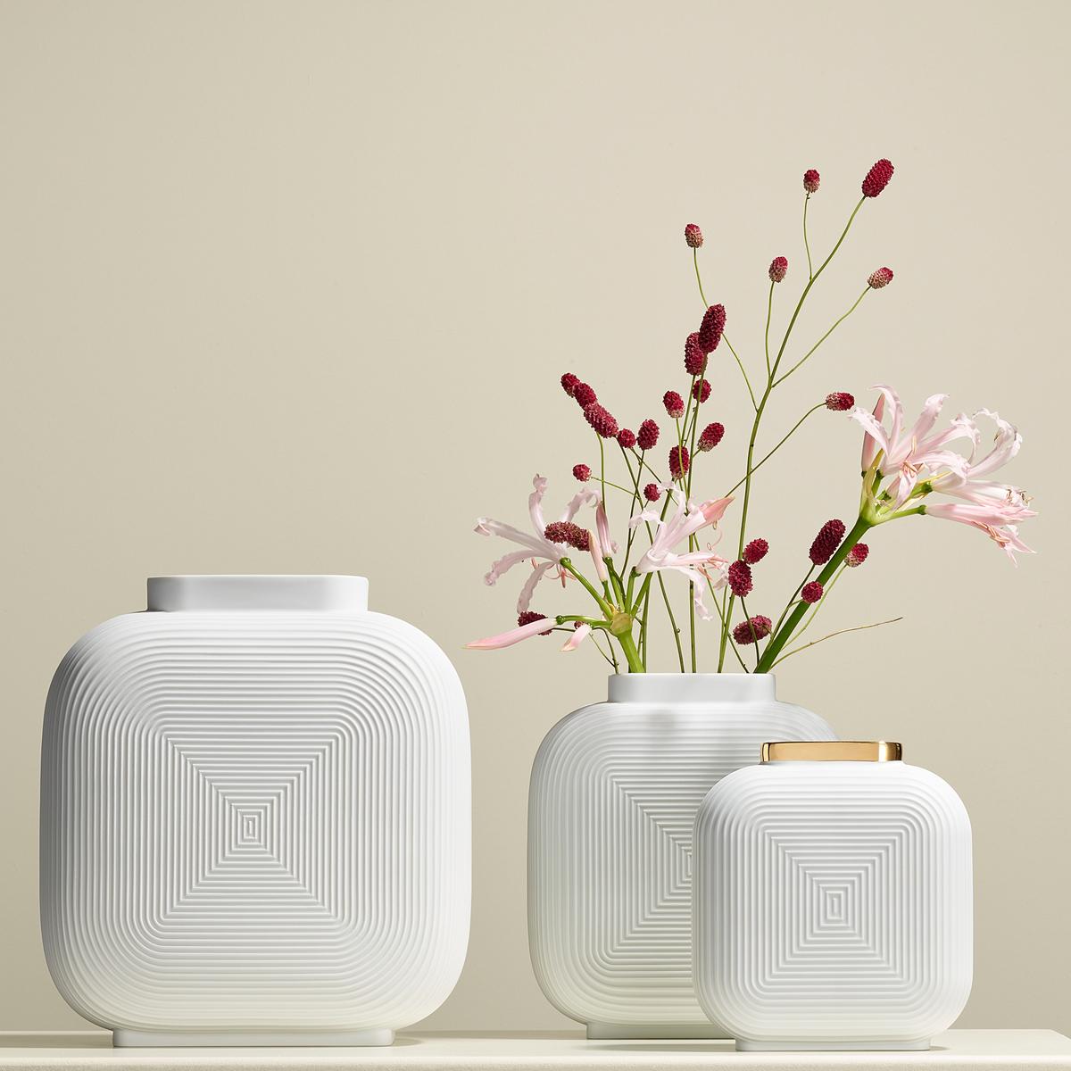 Natural structure, natural harmony. The "Linda" vases by Fürstenberg are inspired by the meditative simplicity of Japanese Zen gardens. The unusual, minimalist square shape with rounded corners is reminiscent of paper lanterns and gives the vases a modern character. A fine groove pattern adds rhythm and structure to the pure, white porcelain surfaces. The collection includes vases with satin and glazed finishes in two different sizes as well as one version with an exclusive gold rim.