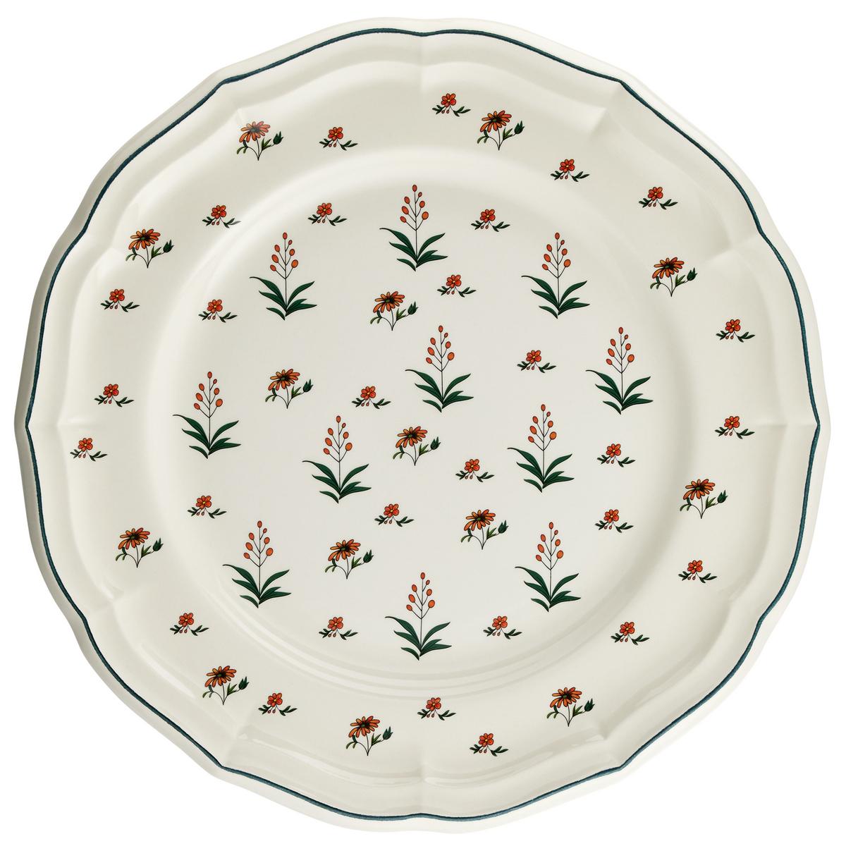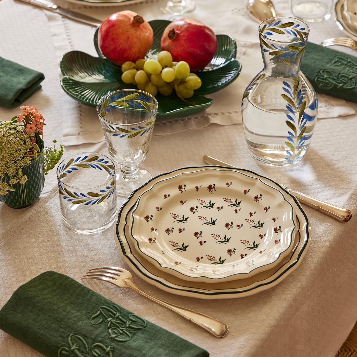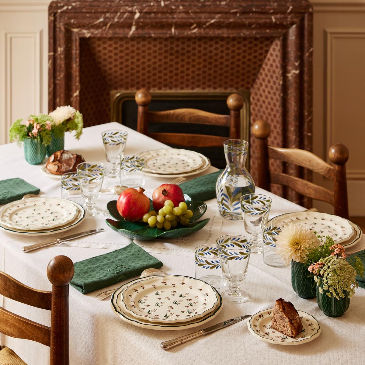 Served on a bed of herbs. With the "Herbier du Paradis" dinner service, Gien reinterprets the iconic "Oiseaux du Paradis" collection. An abundance of small flowers and herbs with red fruits and blossoms populate the creamy white faience in a modern all-over pattern. A hand-drawn stripe in petrol frames the pattern and accentuates the classic elegance of the plates' scalloped rims. Reduced to four plate sizes, a cereal bowl, and a cake platter, the service invites you to mix and match with other Gien collections such as "Filets Rouge" and "Filets Acapulco".