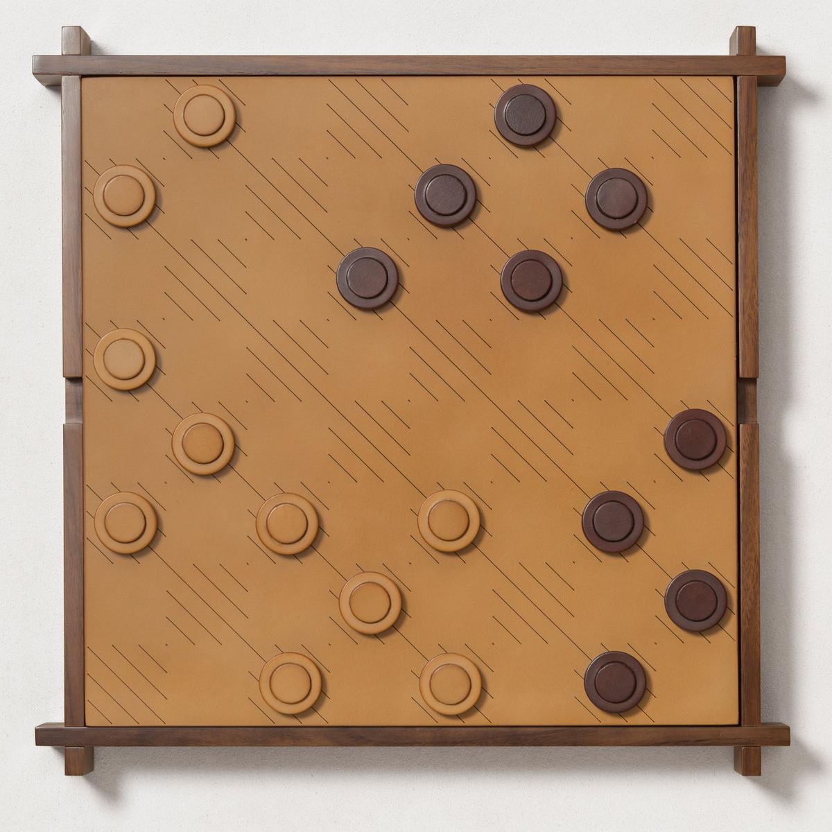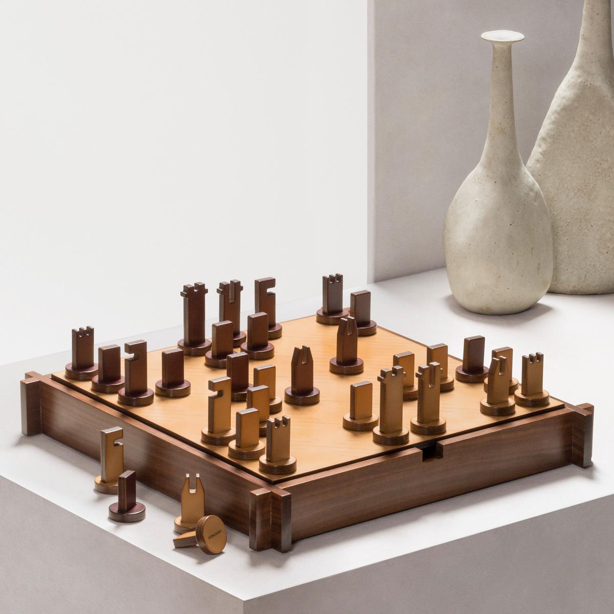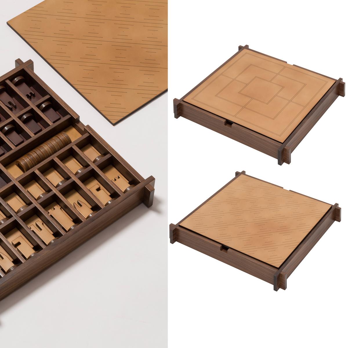 Three games, one timeless design. The "Structura" triple game box by GioBagnara is a robust game set with an elegant vintage look for chess, draughts and mills. The set consists of a carefully designed set box with L-shaped corners made of fine walnut wood and a lid covered on both sides with sturdy sole leather. One side of the lid is engraved with a stylised chessboard pattern, the other with a mill board. The chess and game pieces are also made of dark brown and natural-coloured sole leather. Over time, the durable sole leather develops a unique patina, transforming the box into a living companion.