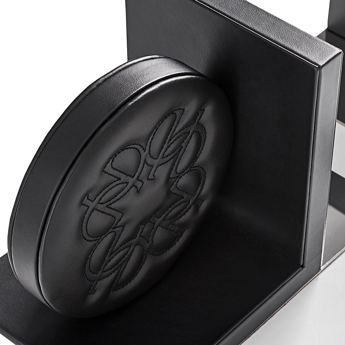 Crafted in dark brown calf leather, the circular elements feature the distinctive Elie Saab monogram embossed in a subtle relief. The delicate texture adds depth while expressing the couture house’s iconic signature with understated sophistication. A stainless steel base ensures stability and introduces a sleek, contemporary contrast to the warmth of the leather.