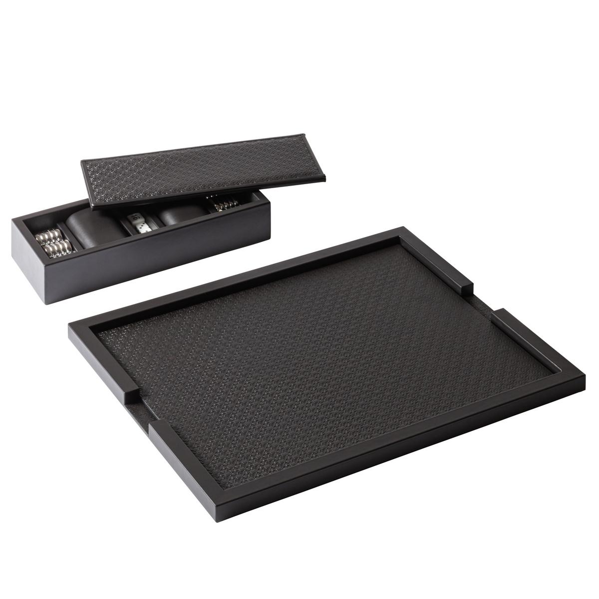 When closed, it appears as an elegant leather-covered tray in dark brown featuring the distinctive Elie Saab monogram in a subtle all-over relief. The sleek, monochrome surface reads as a sophisticated decorative accessory, integrating effortlessly into refined interiors. By simply reversing the removable leather pad, the tray transforms into a fully functional backgammon board. The reverse side reveals an inlaid playing field, meticulously crafted and framed by the leather structure — an unexpected yet harmonious transition from décor to game.