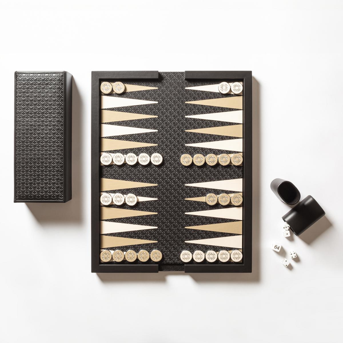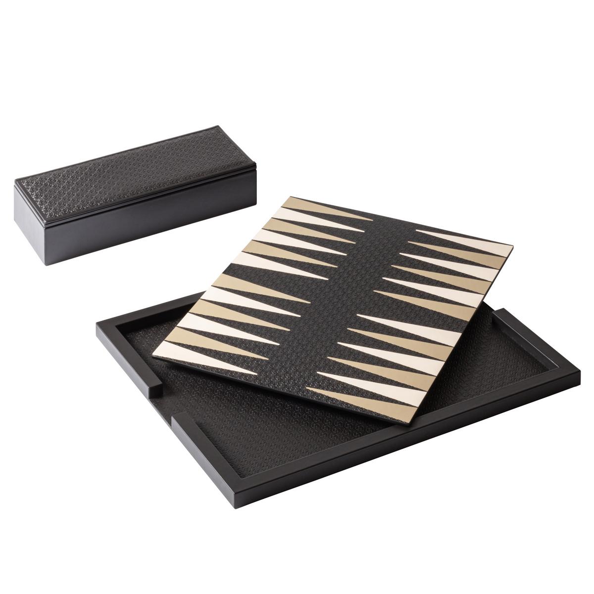 The set is complemented by a leather-covered wooden box with a coordinated lid, designed to store the playing accessories. It contains polished palladium-finished backgammon checkers with leather inserts and shiny silver debossed detailing, two leather dice cups, four dice and a doubling cube.