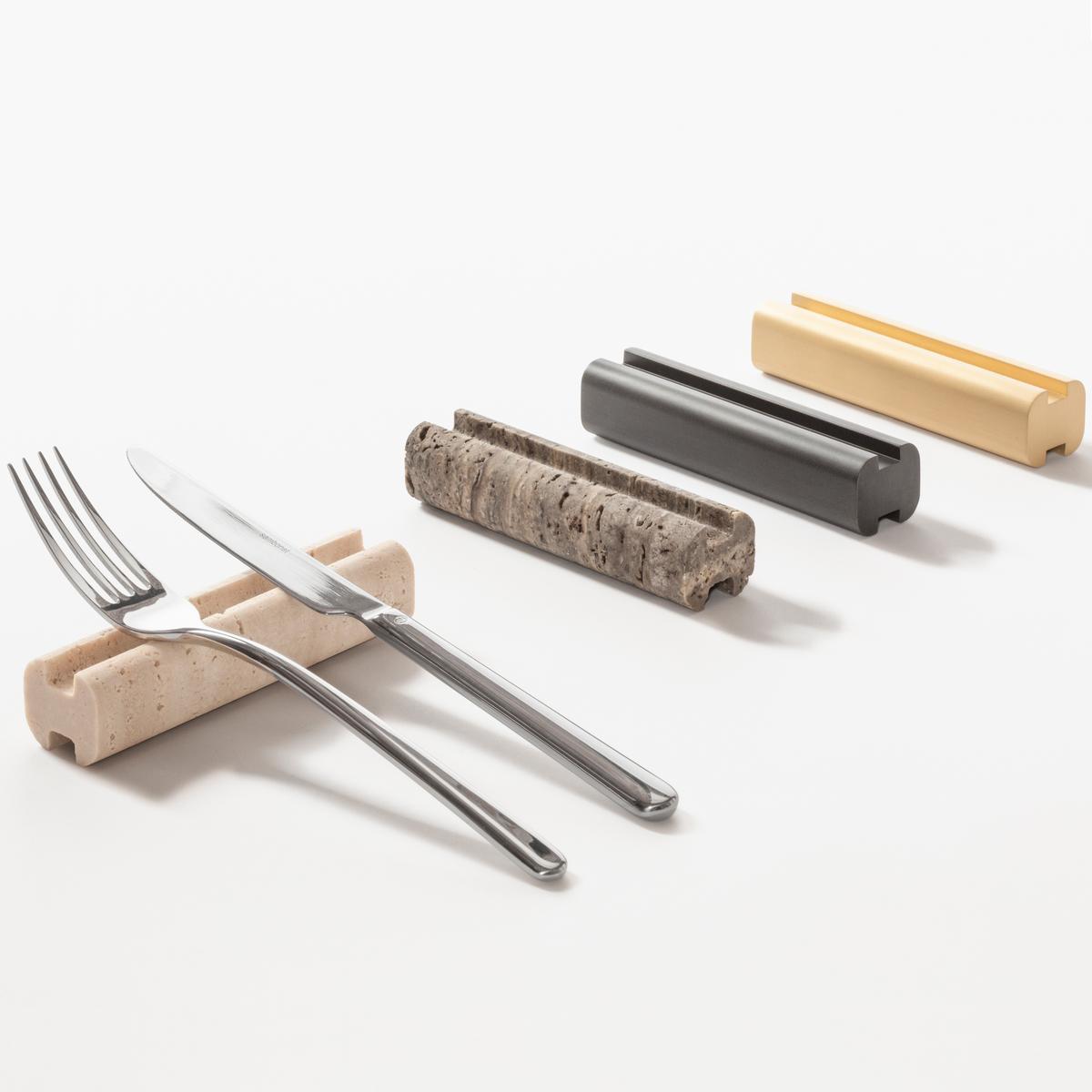 The "Lloyd" knife benches are available in natural stone and metal. The versions made of the natural stone travertine are permeated with natural pores that give each piece its own character. The surface of the metal versions have a brushed finish for an elegant shimmer. With a length of twelve centimetres, the cutlery rests are long enough to place knives and forks next to each other for an effectful presentation.