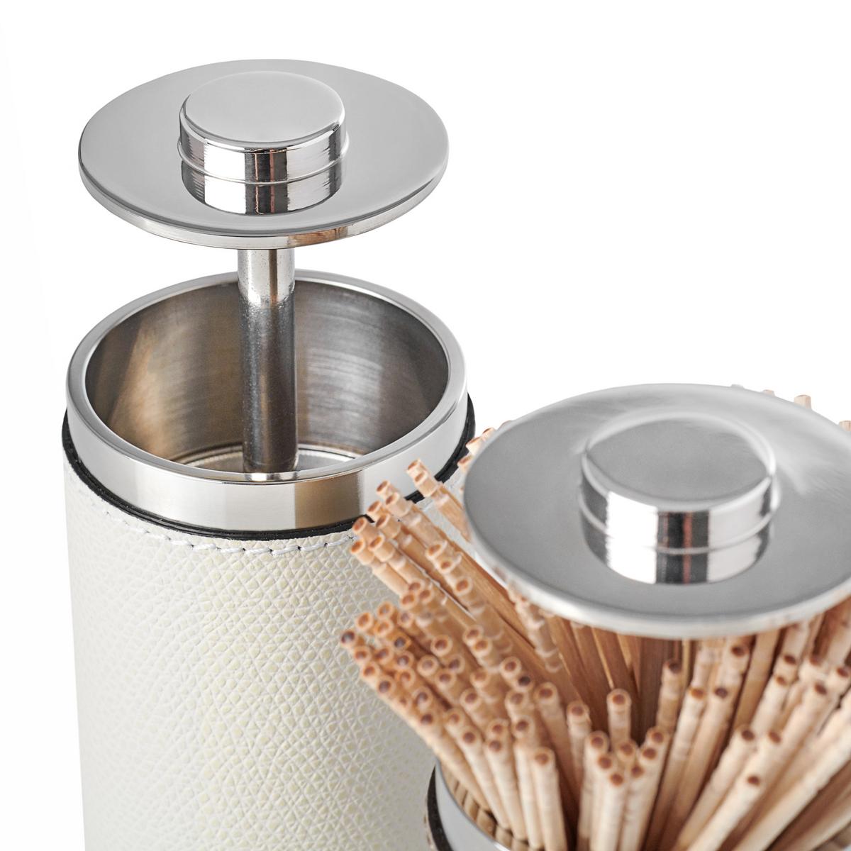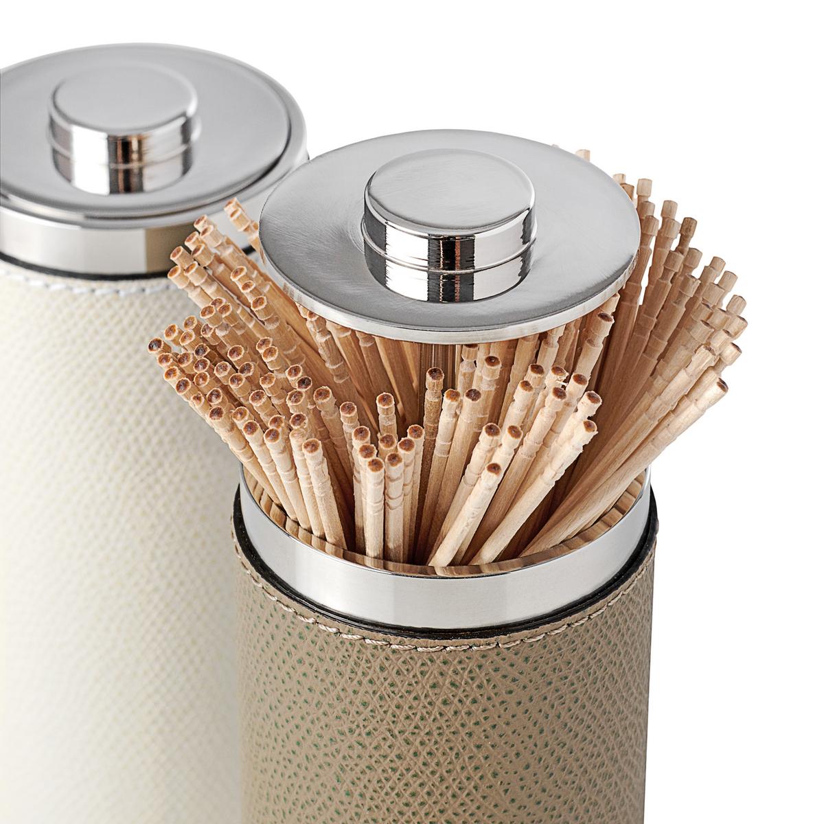 The discreet "Otello" toothpick holder by GioBagnara is a useful and at the same time high-quality manufactured table accessory. A practical push-button facilitates access to the dispenser. After use, the toothpicks disappear back into their leather case and are stored protected and clean.