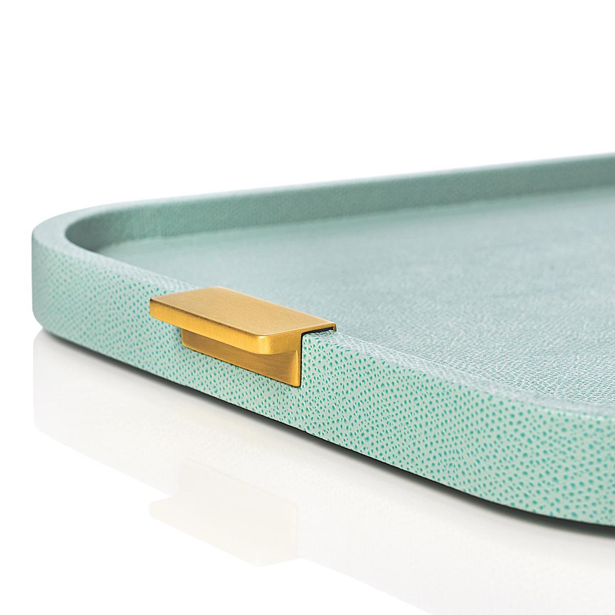 A gentle gesture of hospitality. The "Puccini" rectangular trays in mint by GioBagnara are essential serving aids for sophisticated entertaining. Rounded corners and shiny brass handles give the simple trays a harmonious and inviting personality. Handmade from the best Italian calfskin on a sturdy wooden frame, the trays are as durable and timeless as they are elegant. The light green "mint" shade forms an elegant ensemble with the gold-coloured handles and adds a fresh splash of colour to any room.