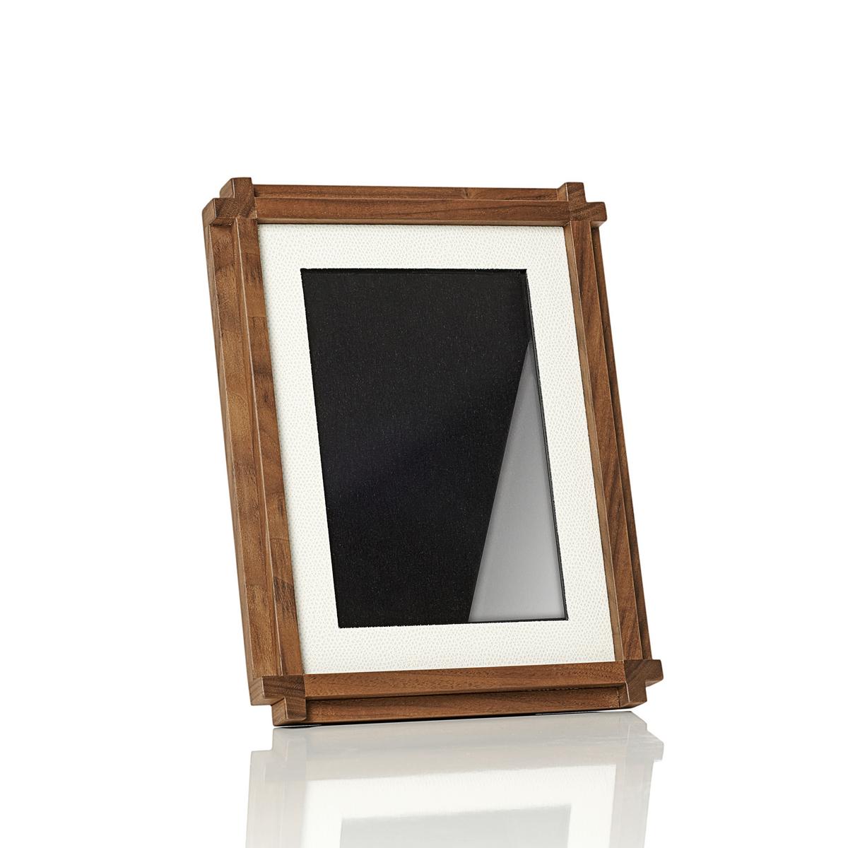 Timeless elegance in wood and leather: The "Structura" picture frames by GioBagnara combine masterful craftsmanship with inviting vintage charm. Sophisticated L-shaped corners give the fine walnut wood frame its distinctive silhouette, while the passe-partout and back, crafted from embossed calfskin in delicate off-white, provide subtle contrast. The interplay of warm wood and softly textured leather creates a harmonious balance in mid-century modern style – elegant, homely, and full of character. A cleverly integrated magnetic stand allows the frame to be displayed either horizontally or vertically with ease.