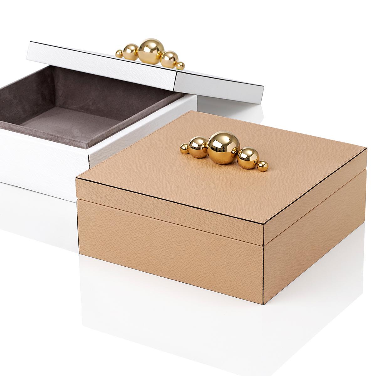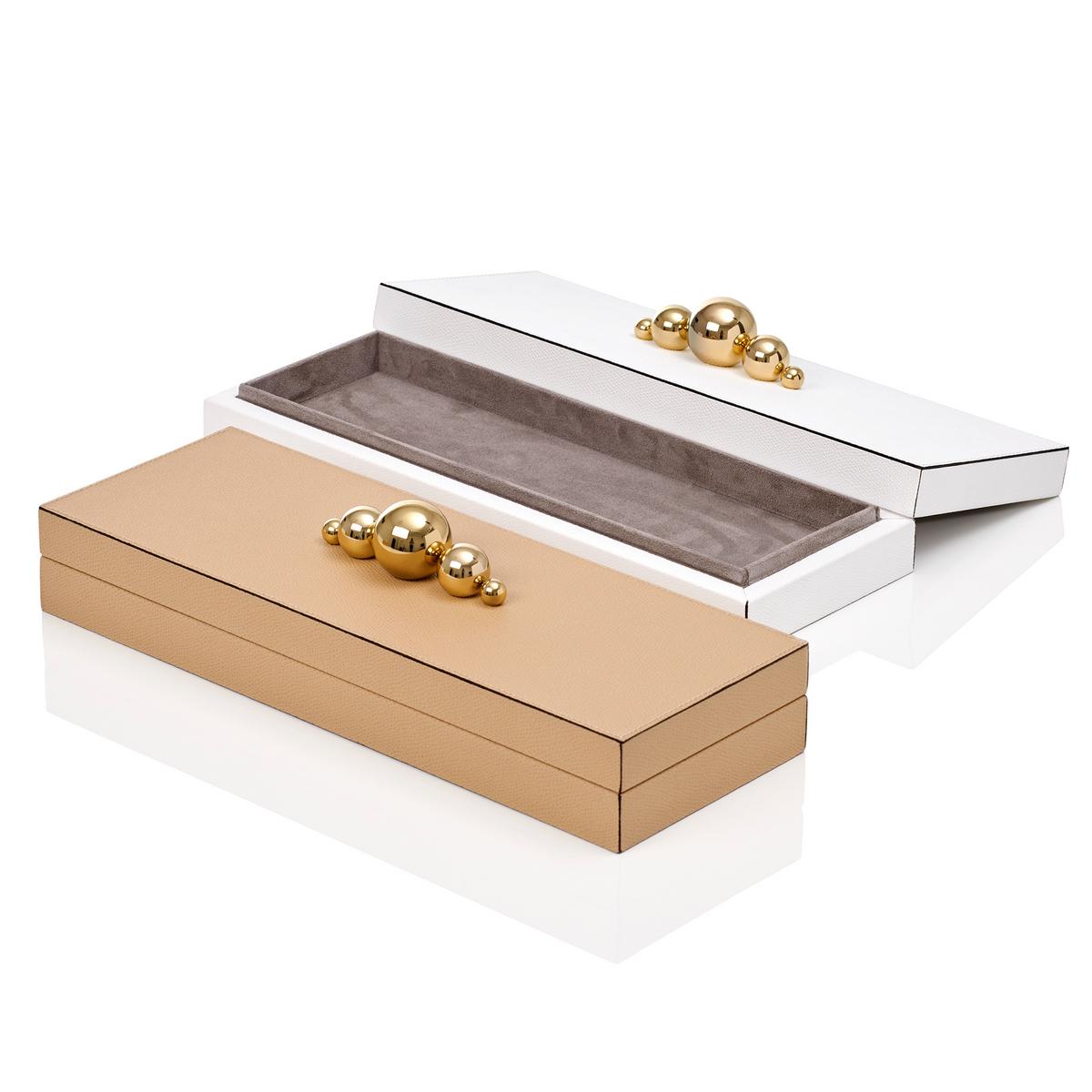 Contrasts between geometric shapes like a prism and a sphere have always fascinated the human being. In the "Champagne" collection the designer was inspired by exactly this contrast. The golden spheres transform the simple handle of a box into an element of high decoration that invites to come closer and explore its shape and function. Beneath the water- and scratch-resistant leather is a firm wooden body. The boxes are lined with velvety soft suede.