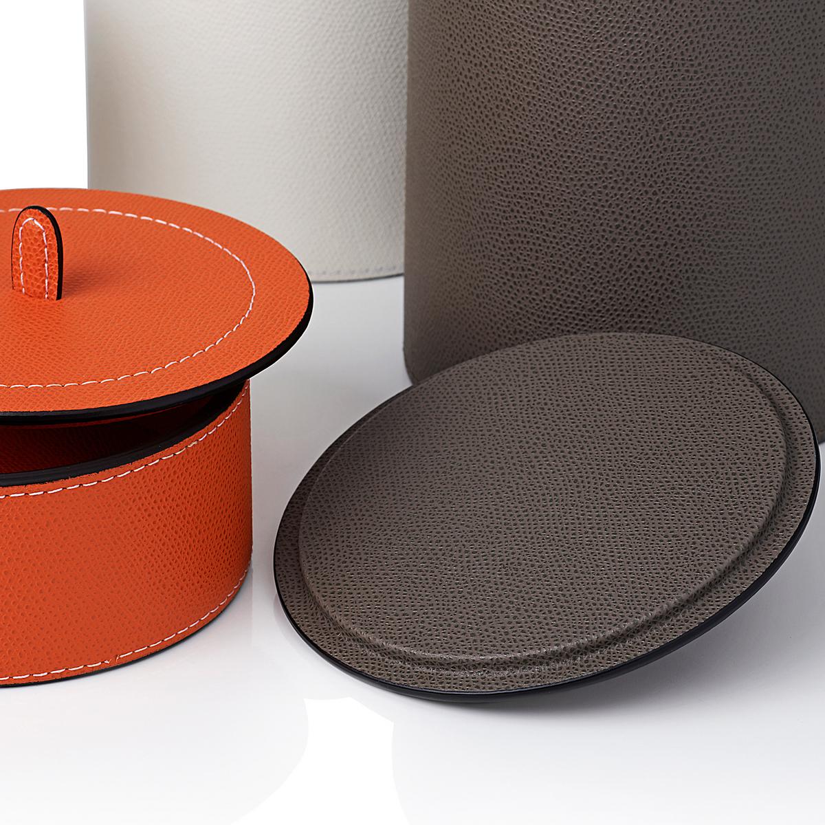 The "Harris" containers are available in three different sizes and in several wonderful colours. The fine calf leather has decorative white hand stitching. An individual piece makes an eye-catching ornament. However, bold home furnishers may like to put the various colours next to one another, especially as one can also play with the various sizes. The fantastic leatherwork is also fascinating: elegant, but also scratch and water resistant.