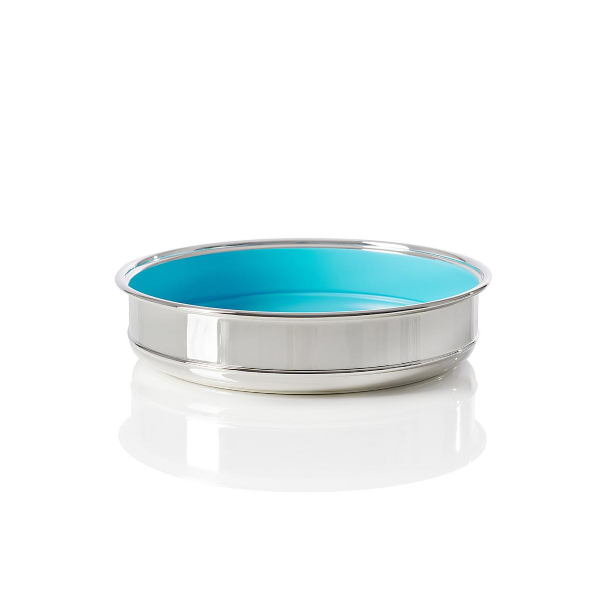 The "Azzuro" centrepiece by Greggio combines the elegance of classic silver-plated tableware with a refreshing touch of color. The polished silver exterior contrasts beautifully with the vibrant turquoise enamel interior, creating a modern accent that evokes Mediterranean lightness and summer freshness.