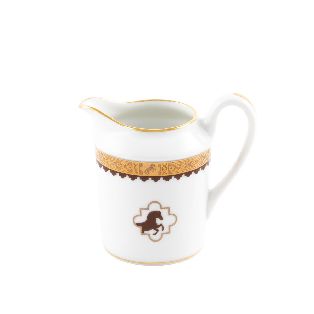 The collection's leitmotif is an Andalusian horse decorated as a palfrey in medieval style, framed by an Arabic mashrabiyya window. In addition to the multicoloured depiction on the presentation plates and bread plates, the motif can also be found as part of the shimmering gold borders and as a silhouette inside the cups and on the saucers. The generous gold applications demonstrate the elegance and sophistication of the porcelain manufactory and elevate the collection to the excellency of modern dining culture.