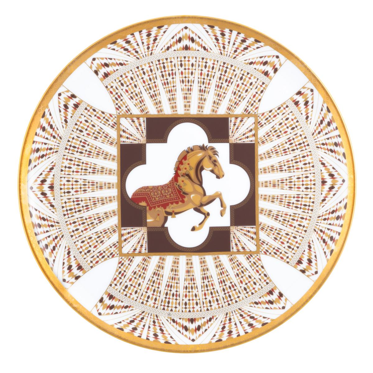 Majestic, noble, powerful. The "Cavalier Royal" dinner service by Haviland carries the spirit of the ancient equestrian culture of Seville, the capital of Andalusia. The gleaming white Limoges porcelain features detailed decorations with equestrian motifs and occidental patterns in the warm gold and red hues of the Mediterranean. A golden QR code on the back of each item leads to a website with useful and interesting information about the design, manufacturing process and care of the dinner service.