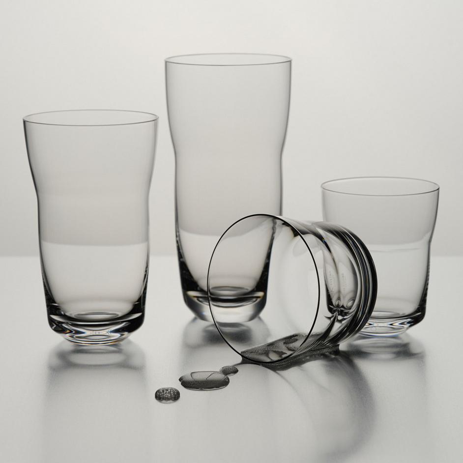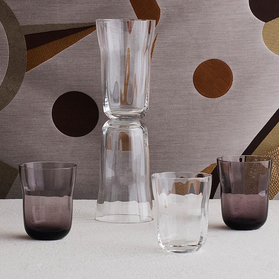 The design's faceting on the tumblers is applied manually to the molten glass before it's blown into the mold. The fine tumblers, delicately curved to fit comfortably in the hand are available in a puristic "Clear" version of with a distinct facet called "Flow". The latter is also available in colors such as amber or smoky gray.
