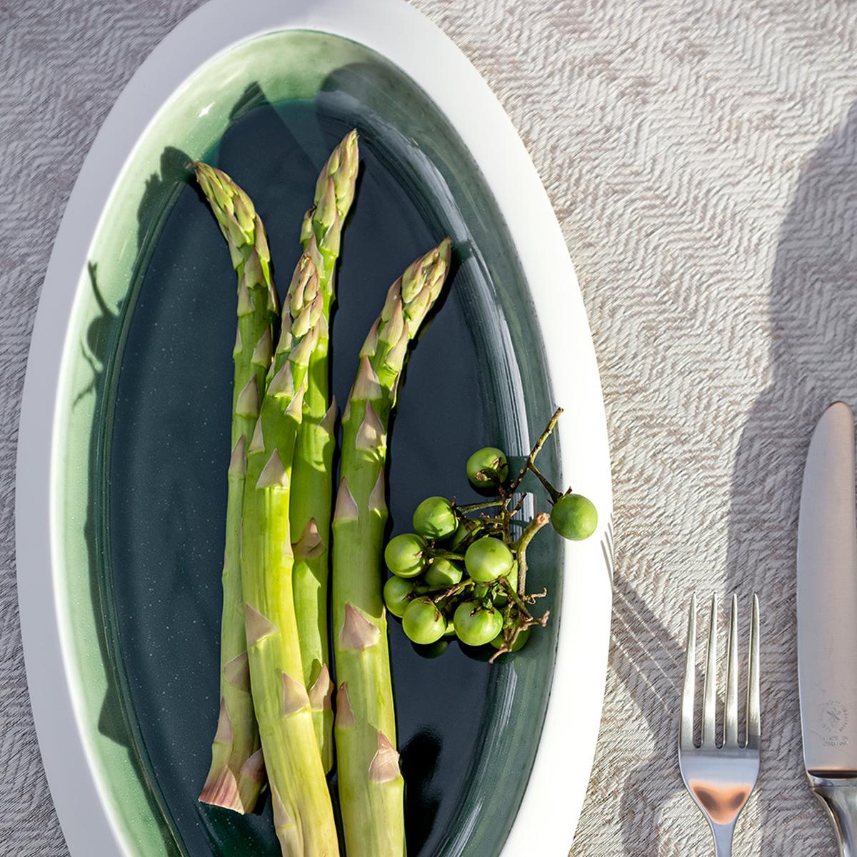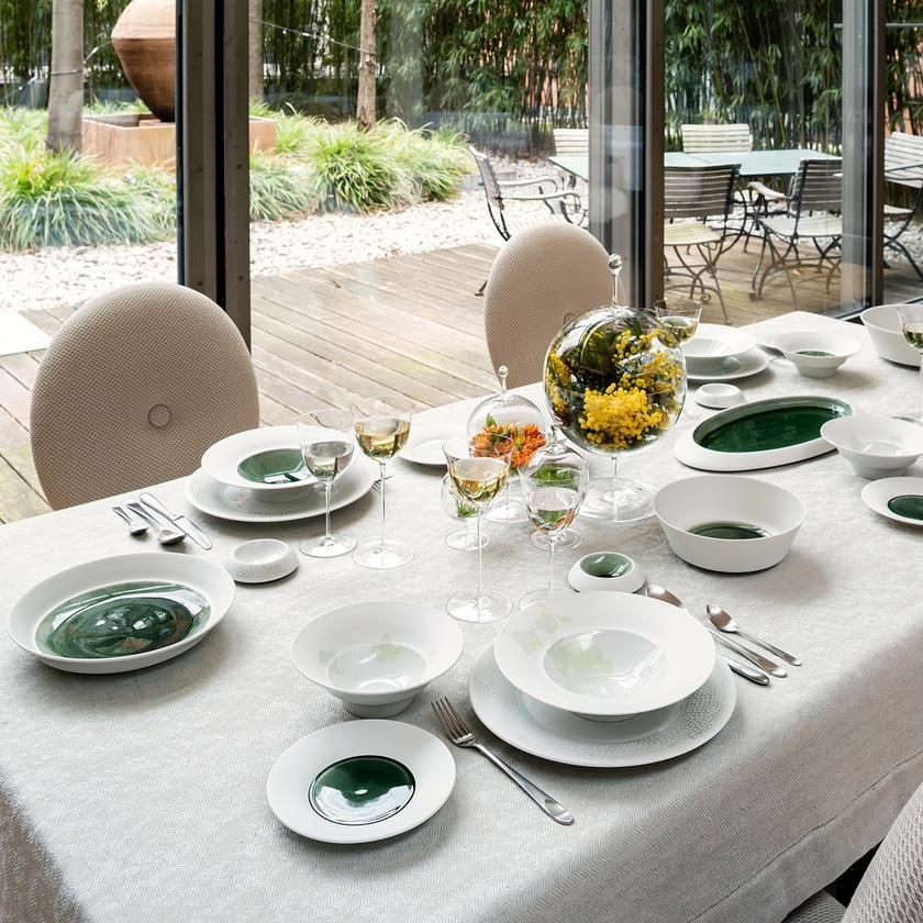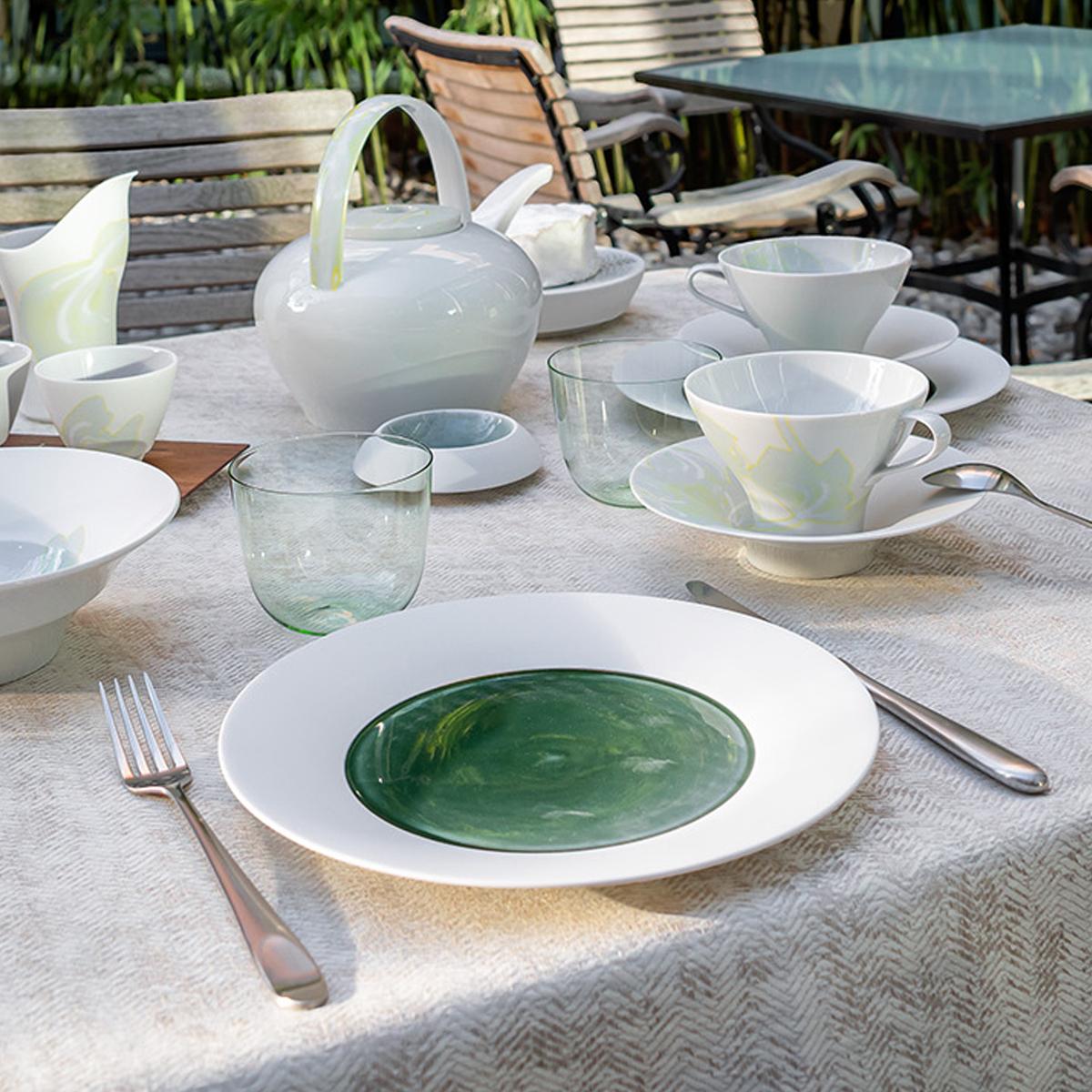 The rims of the "Emerald" plates are made of smoothed silky matt, unglazed bisque porcelain and form a pleasant contrast to the iridescent green colour glaze inside the plates. The lively high-fire glaze alternates from juicy leaf green to an intense emerald color.