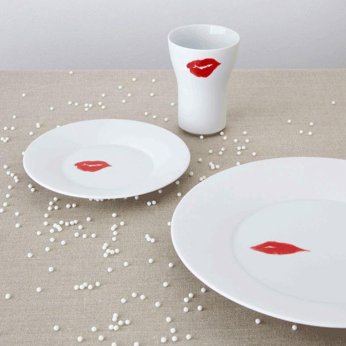 Say it with a kiss: The "Kiss" collection by Hering Berlin brings out the sensual aspect of the manufactory's delicate porcelain creations. The cups and plates are made of hand-polished bisque porcelain. Their unglazed surfaces retain a velvety matte finish reminiscent of the soft texture of skin. A bright red cobalt drawing of a voluptuous kiss impression glows on the porcelain as if freshly kissed.