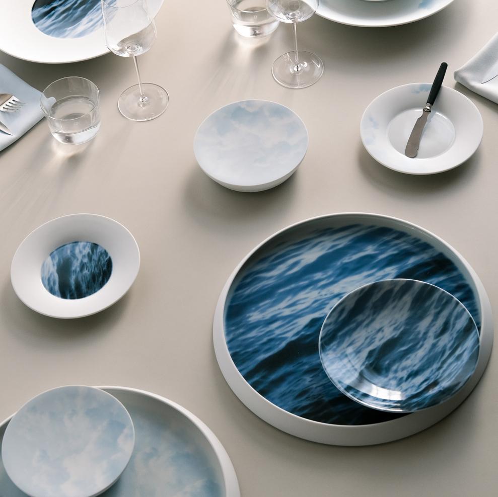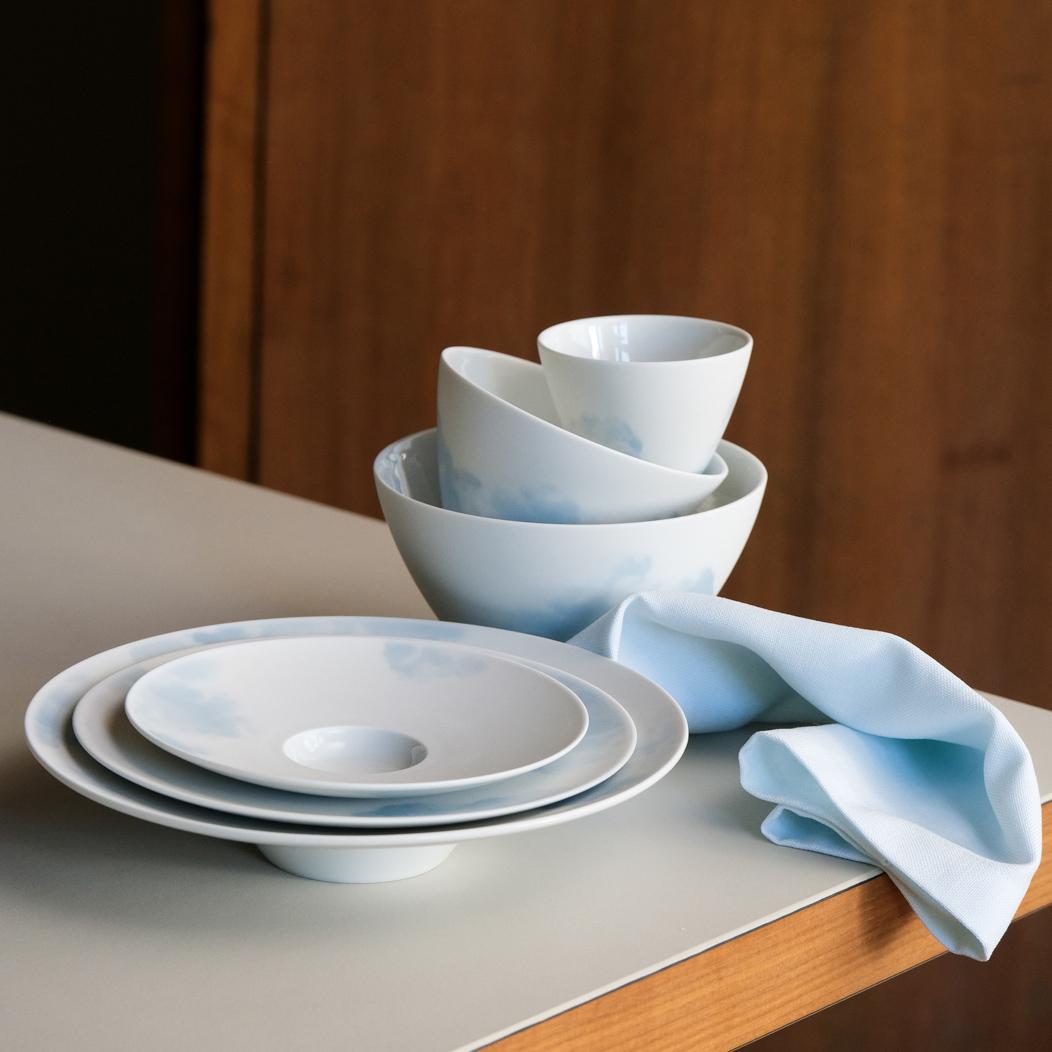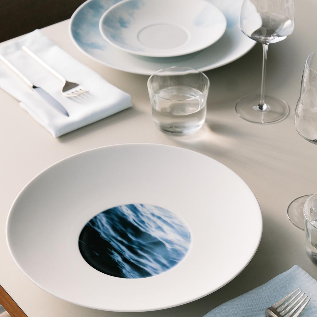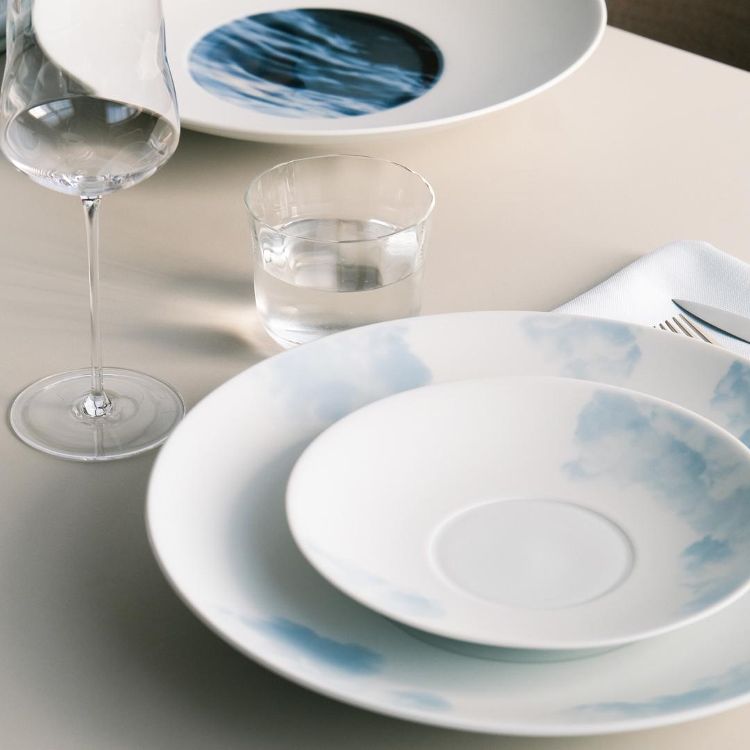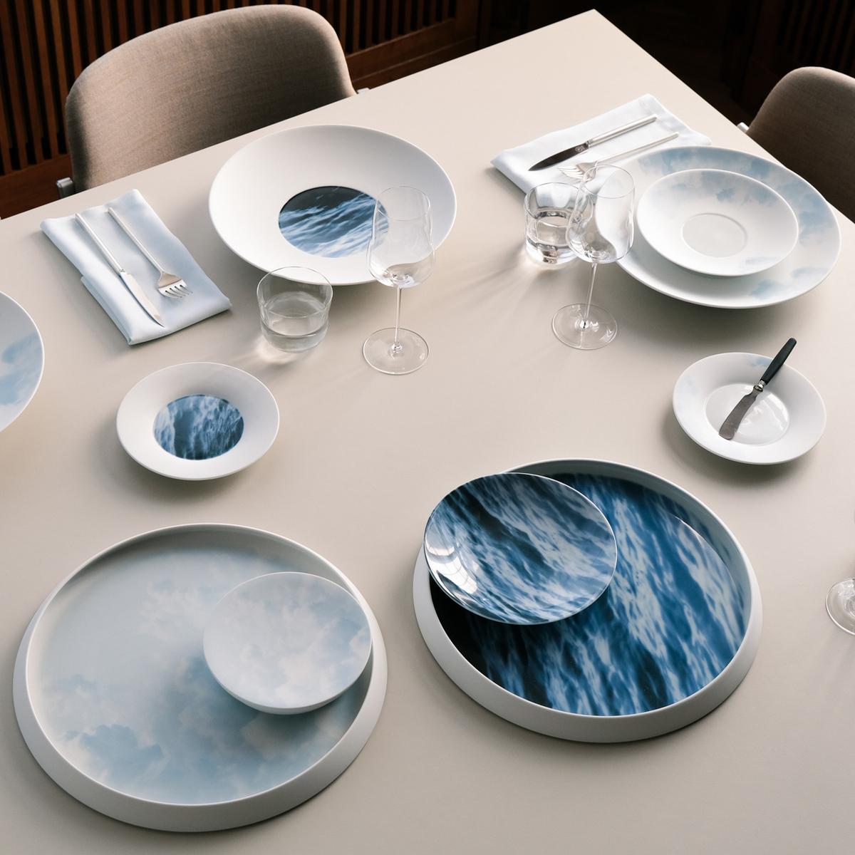Hering Berlin introduces an innovative technique to merge the printed wave pattern with the glaze, intensifying the contrasts between the shiny décor and the white bisque porcelain of the rims. The soft cloud decor, on the other hand, floats in powdery tones like the reflection of the sky on the matt bisque surfaces. Both decors invite you to mix and match creatively with other Hering Berlin dinner services to create deep blue tablescapes and sophisticated maritime concepts.