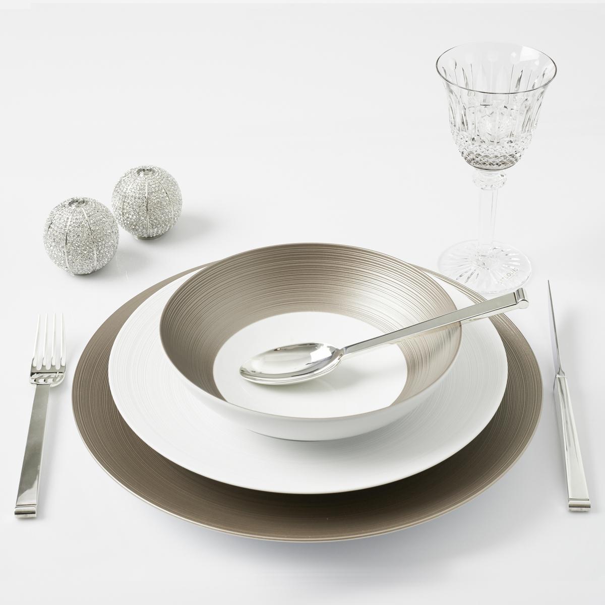 "Hémisphère" is the flagship of the exclusive porcelain manufacturer J.L. Coquet. "Hémisphère Grey Metallic" is crafted entirely by hand from finest Limoges porcelain. The distinguishing feature of the Hémisphère series is its broad, delicately structured rim. The fine surface structure also has a distinctive feel. At least 15 different work steps are necessary to produce a single piece for the "Hémisphère Grey Metallic" dinner service.