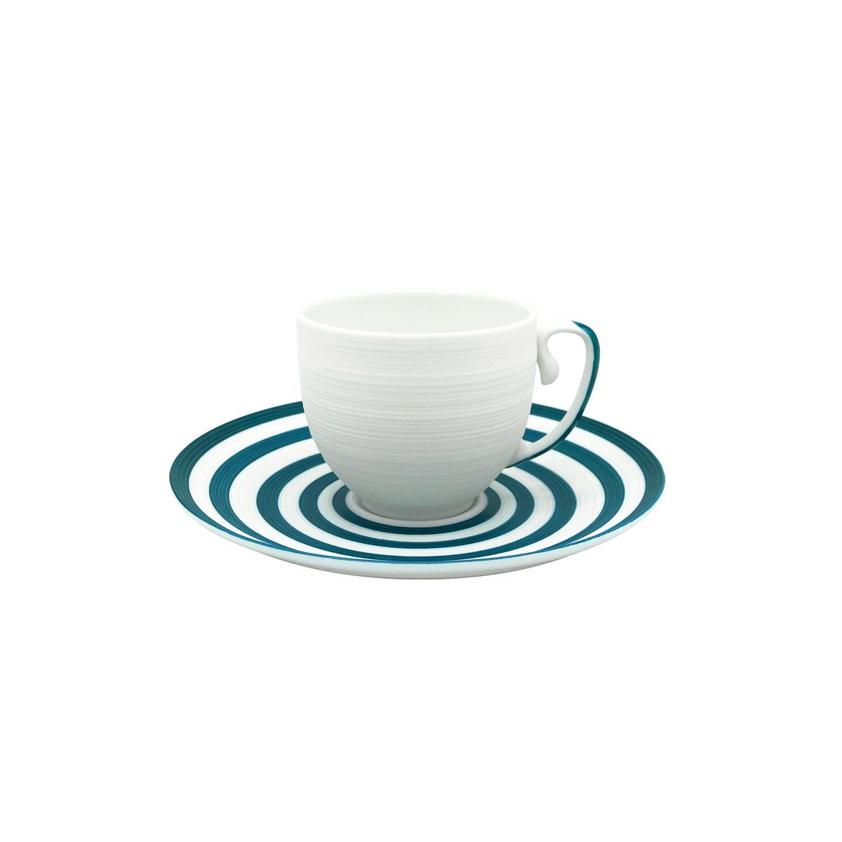 "Hémisphère Persian Blue Stripe" double espresso cup, white cup and "Hémisphère Persian Blue Stripe" saucer by J.L Coquet