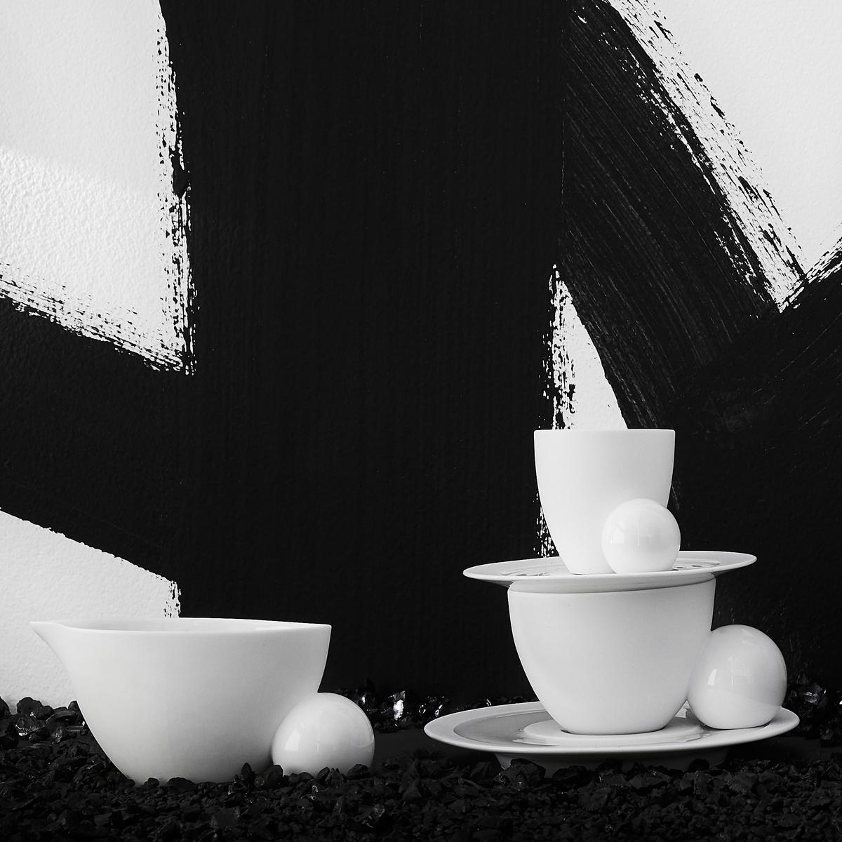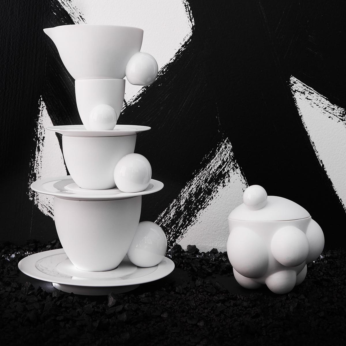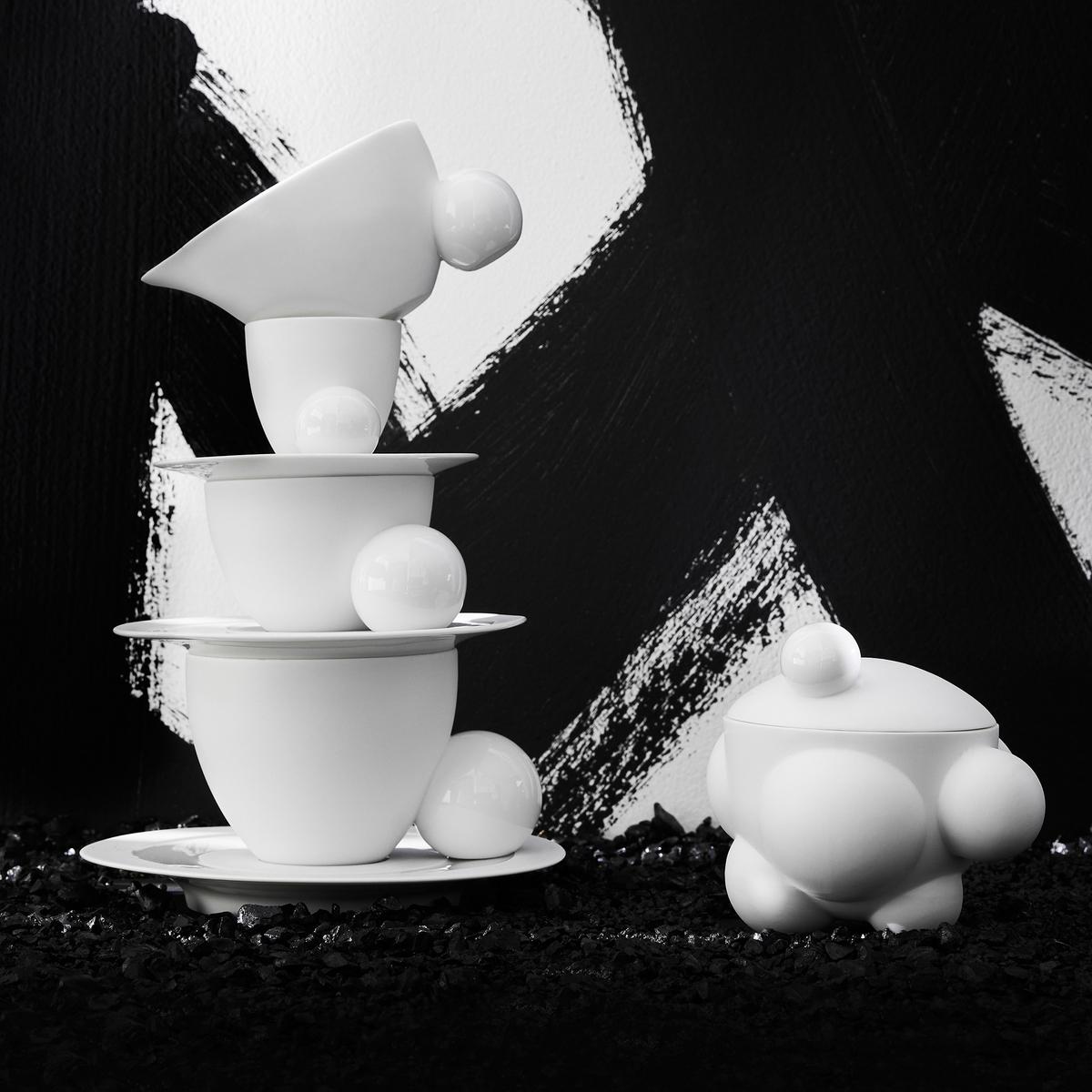 French designer and sculptor Thomas Bastide loves to surprise and captivate with his passion for geometry and volume. Looking at the effortlessly delicate porcelain by J.L Coquet, you would never guess the technical challenges Bastide's spectacular visions pose in the manufacturing process. Up to six individual moulds are needed to manufacture the most complex pieces such as the teapot and the vase. The simpler pieces such as the cups and the milk pourer add to the unique and unforgettable experience with spherical handles that subvert expectations and challenge perceptions.